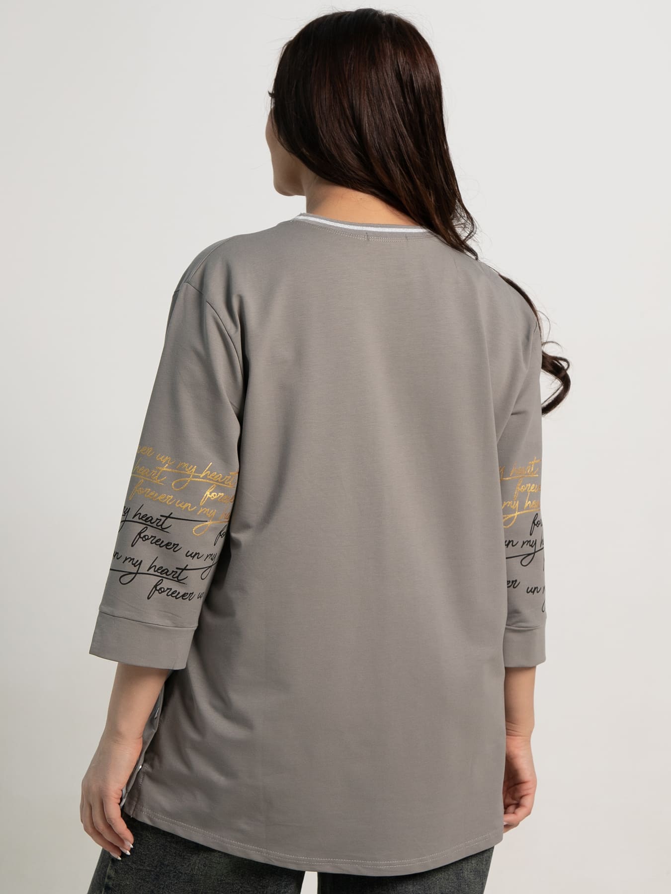 Удлиненная блуза прямого кроя с втачным рукавом длиной 3/4 — отличный выбор для создания неповторимых образов. Горловина округлая. По линии низа спереди расположен притачной широкий элемент, который добавляет интересный акцент. По бокам расположены ряды из трех кнопок, подчеркивая стиль и функциональность. Рукава оканчиваются манжетами. На переднем полотнище и рукавах выполнена яркая фотопечать, которая делает модель выразительной и современно насыщенной. Эта блуза станет оригинальным дополнением любого гардероба.