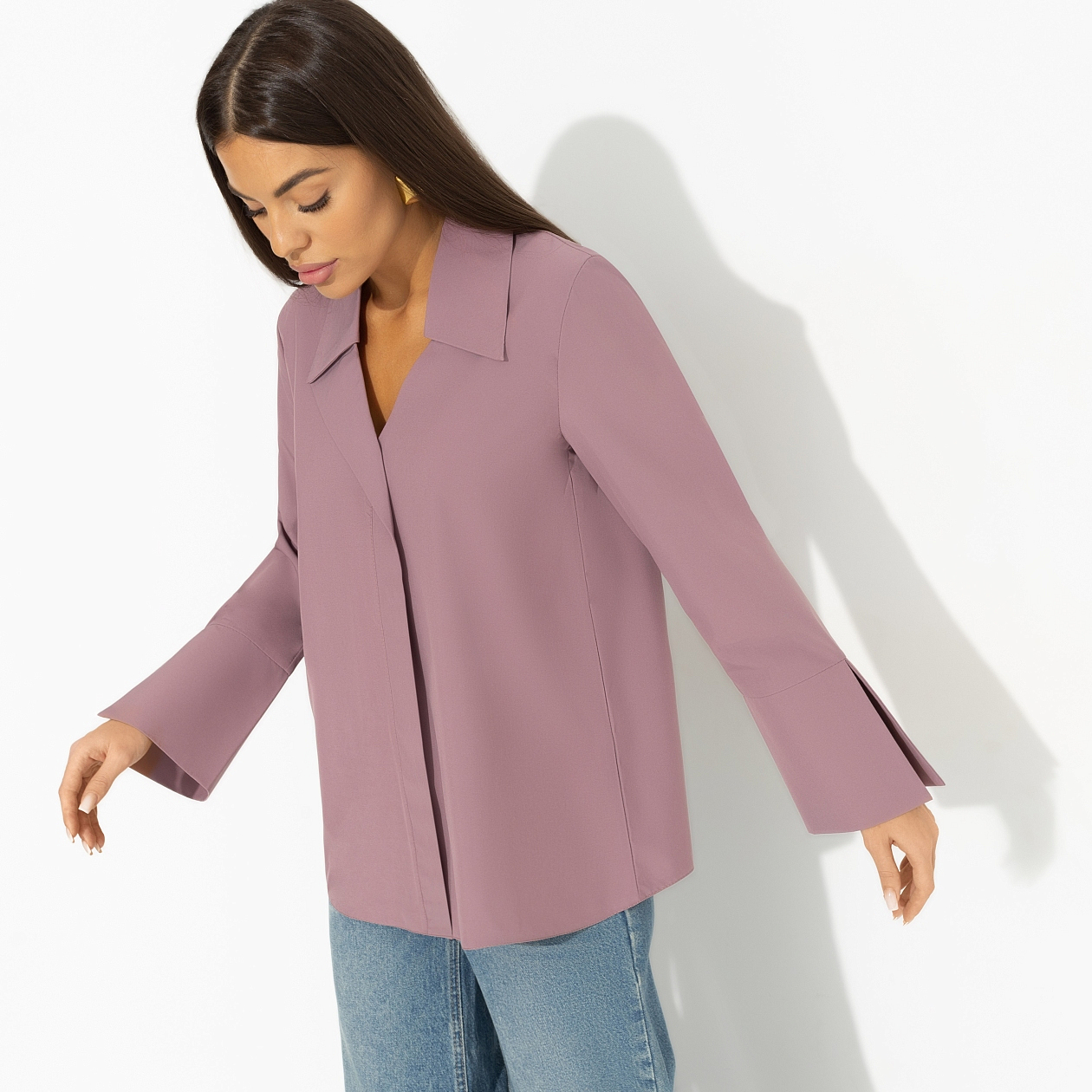 Что бы ни происходило накануне, утром ты свежа, как майская роза. Залог успеха – восьмичасовой сон и блуза в правильном оттенке. Цвести и пахнуть – твое любимое занятие. Блуза прямого кроя с лацканами. Разрезы на расклешенных манжетах. Скрытая линия пуговиц. Изделие хорошо смотрится в заправленном виде и навыпуск.