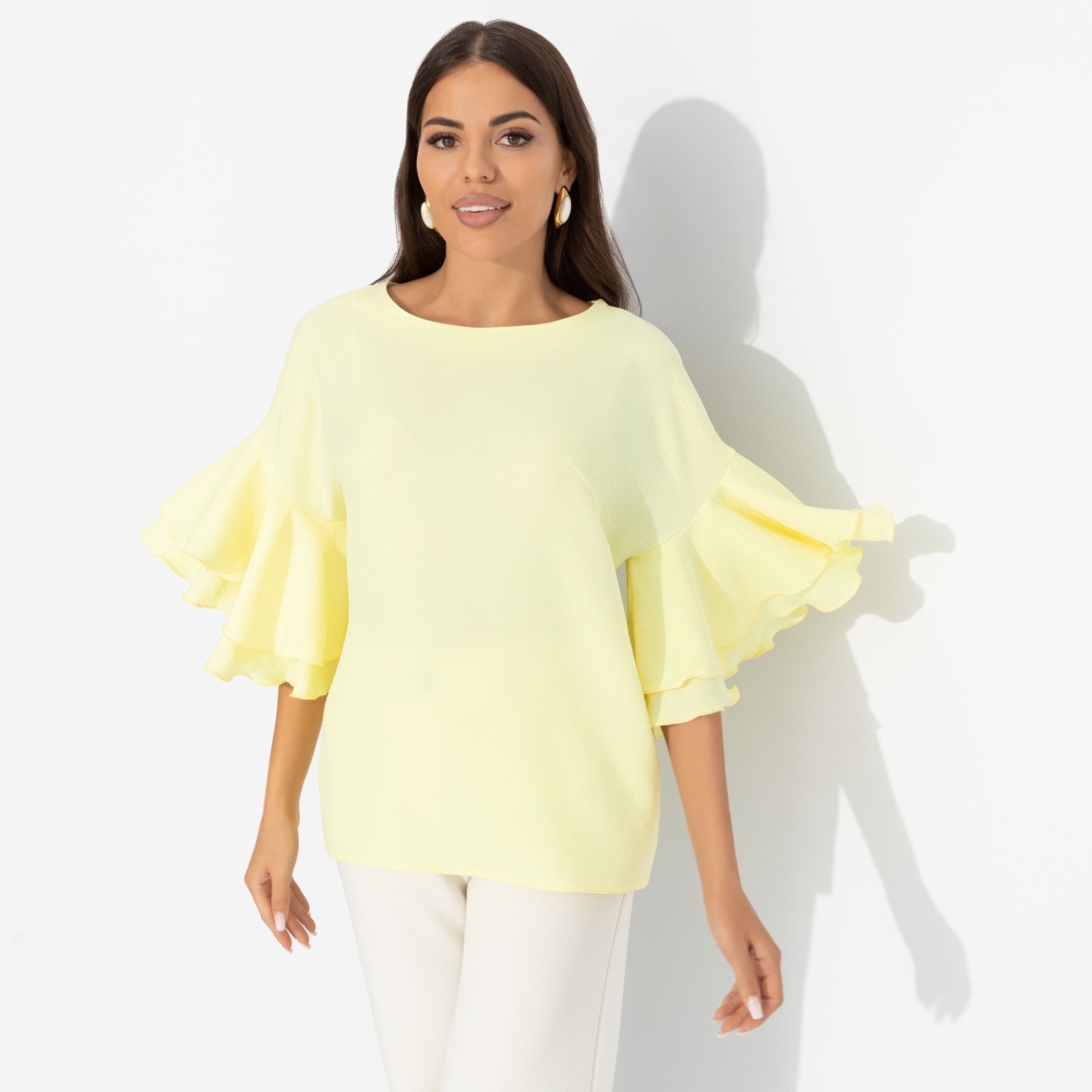В блузе ЧАРУТТИ ваша энергия обнажается. Бьет ключом и светит ярко, обеспечивая молниеносную влюбленность всем вокруг. Магия притяжения в нежном лимонном цвете. Блуза прямого кроя. Спущенная линия плеча. Объемные рукава декорированы двумя слоями рюш. Блуза хорошо смотрится в заправленном виде и навыпуск.