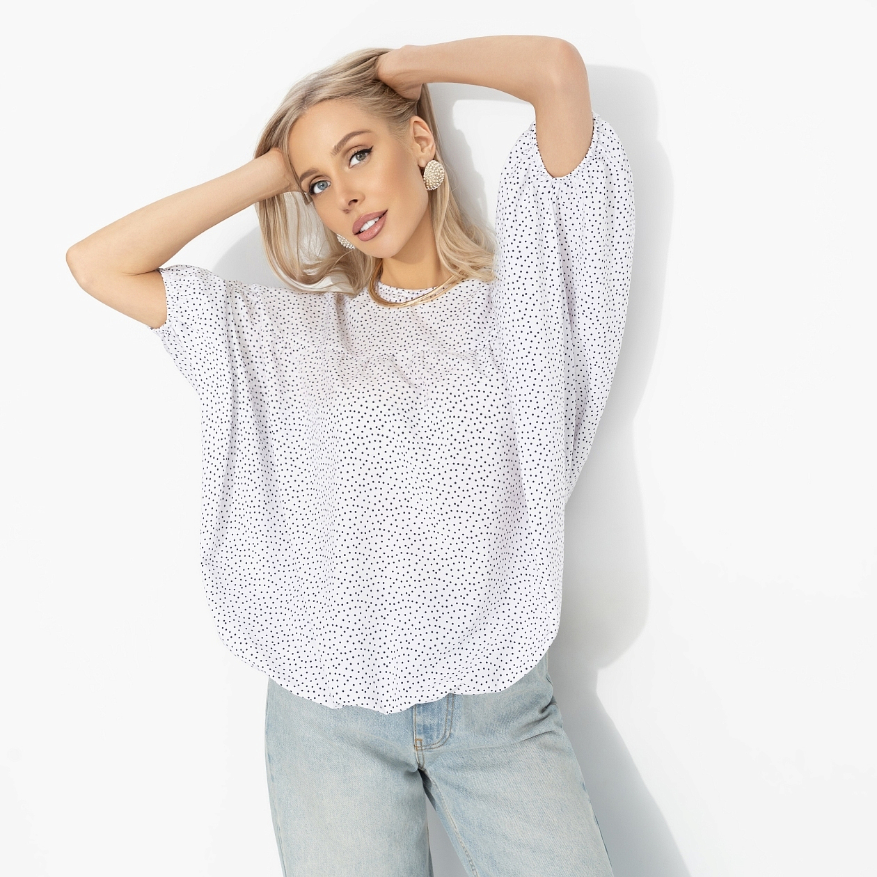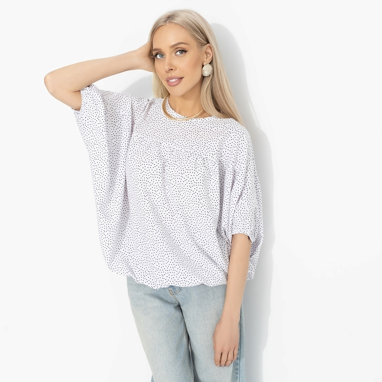 Романтичный наряд – лучший выбор на каждый день. Особенно когда он стартует с лёгкой блузы ЧАРУТТИ и заканчивается прогулкой, которую никто не планировал. Ветер играет тканью, город светится огнями, а настроение как в любимой мелодраме. Блуза свободного силуэта из ткани «ниагара». Спущенная линия плеча, мягкий округлый вырез, свободный рукав. Материал лёгкий, струящийся, красиво ложится по фигуре и приятен к телу.И всё только начинается.