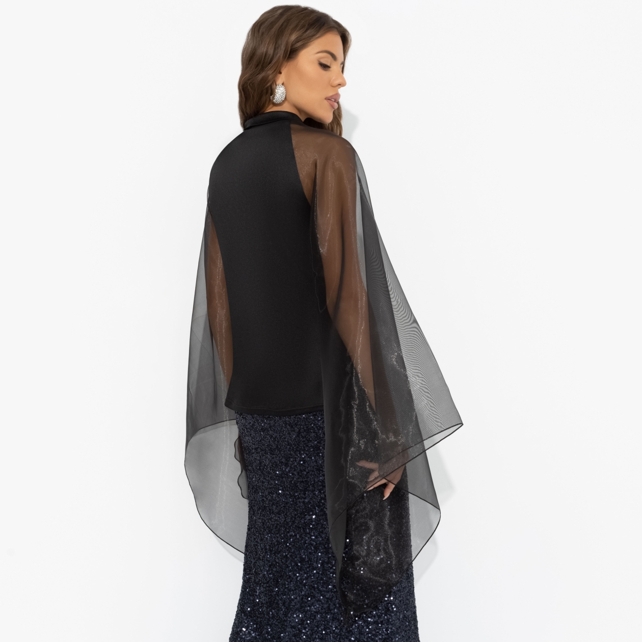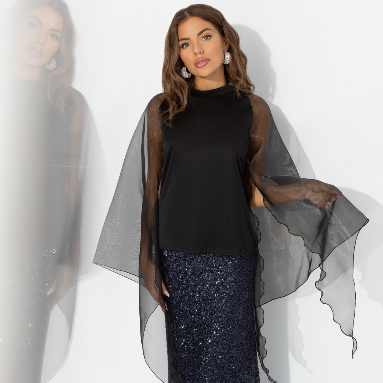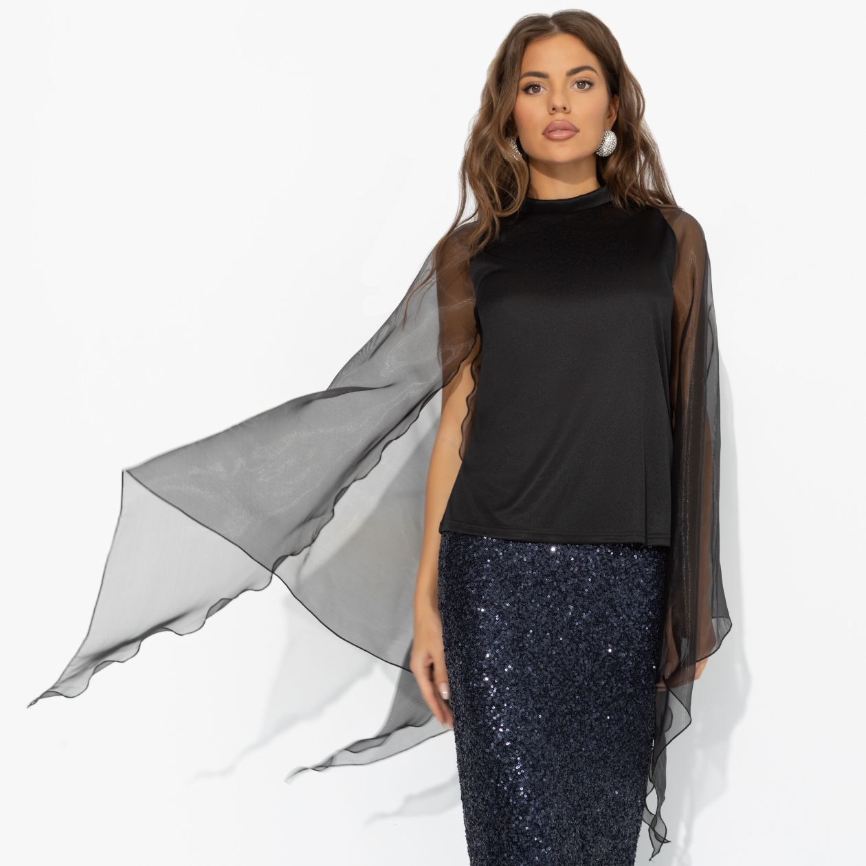 Одной рукой поведет‒ очарует, другой ‒ заманит в свои невидимые сети. Полупрозрачные рукава-крылья этой блузы превратят тебя в загадочную незнакомку: одно движение ‒ и магия в деле. Блуза из трикотажа с акцентными рукавами идеально подходит для нарядного образа. Ее легко комбинировать как с классическими брюками, так и с акцентной юбкой, расшитой пайетками. Для вашего идеального образа на Новый год.