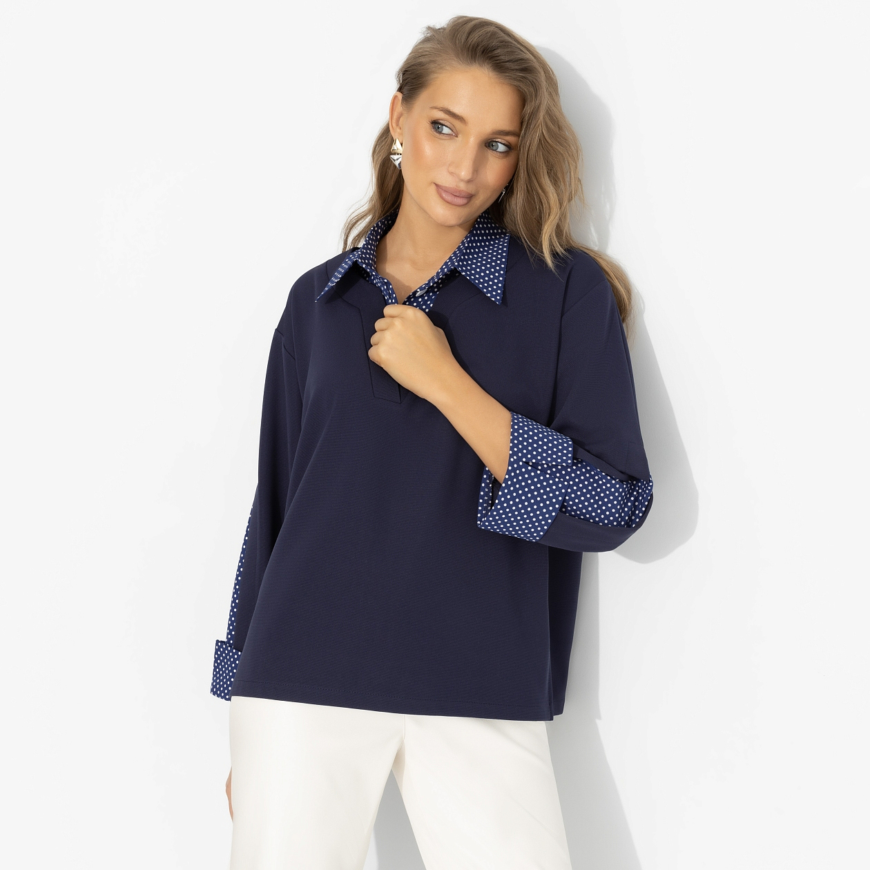 Она приходит на совещание так, будто оператор уже включил свет. И нет, это не совпадение – просто легенды всегда чувствуют, что они находятся в кадре. Глубокий синий добавляет серьёзности намерениям, контрастные манжеты и воротник создают эффект «я продумала образ», даже если собралась всего за 7 минут. Свободный крой даёт комфорт, а чёткая линия плеч очерчивает характер. Камера любит её. Коллеги – тоже. Иногда даже слишком...