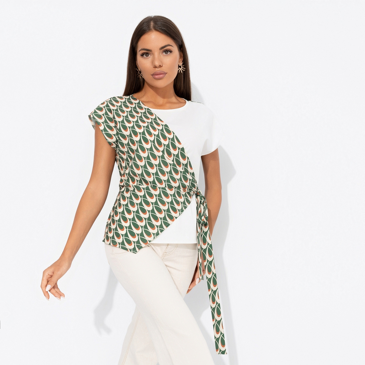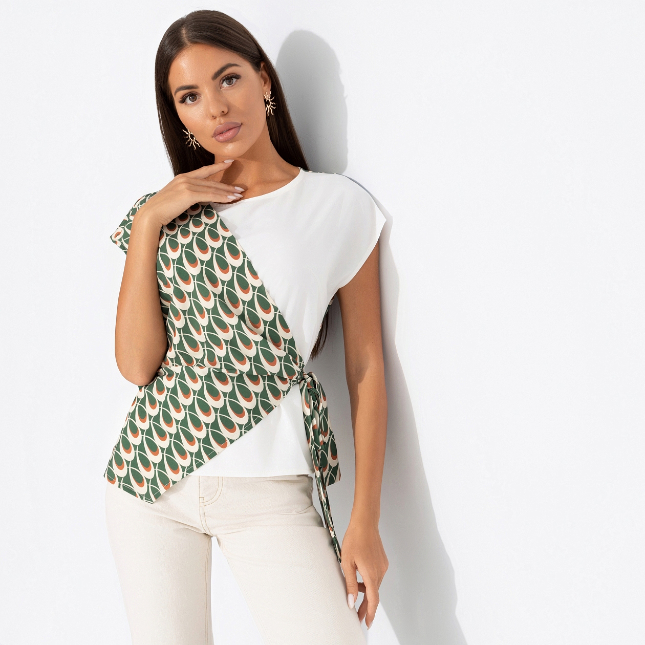 Её обычный вторник превращается в день модного показа. Необычный крой крой играет в дуэте с дерзким узором. В блузе ЧАРУТТИ можно быть любой – веселой или серьезной, собранной или расслабленной. Принятие любых ваших граней гарантировано. Блуза акцентного кроя на завязках. Имитация многослойности.