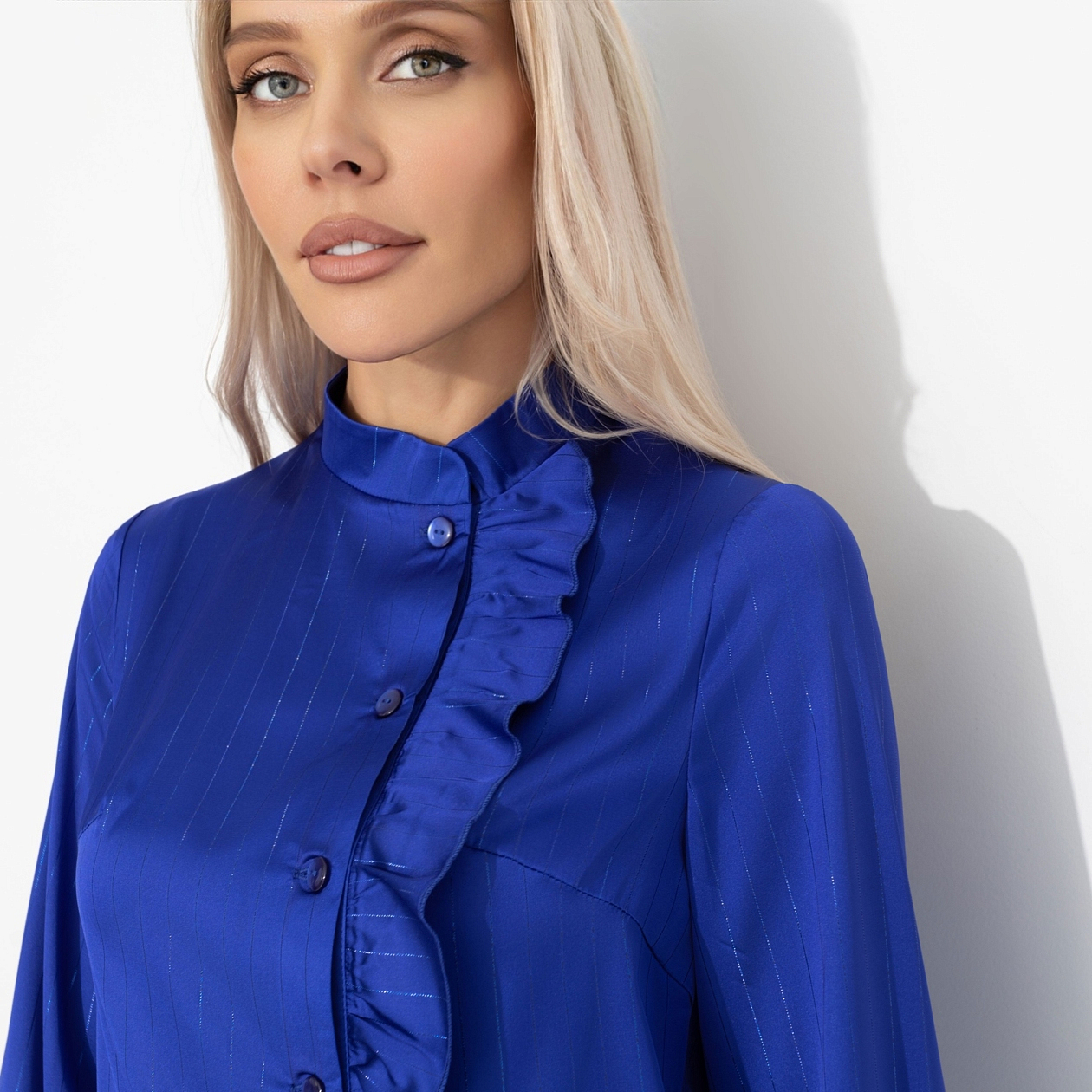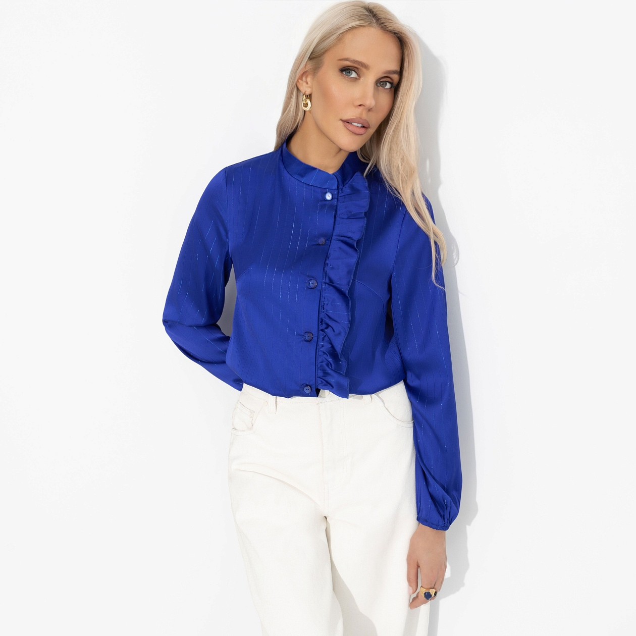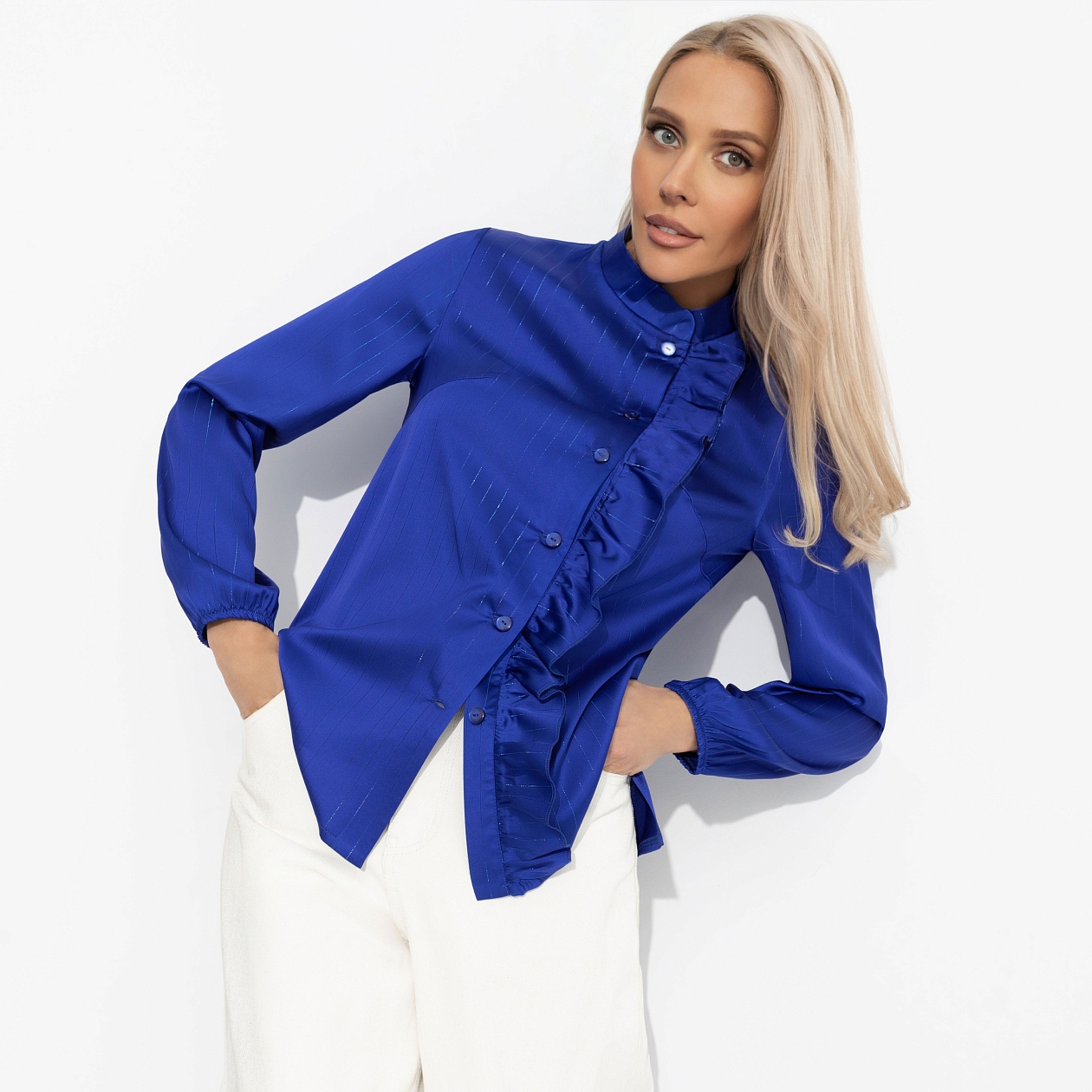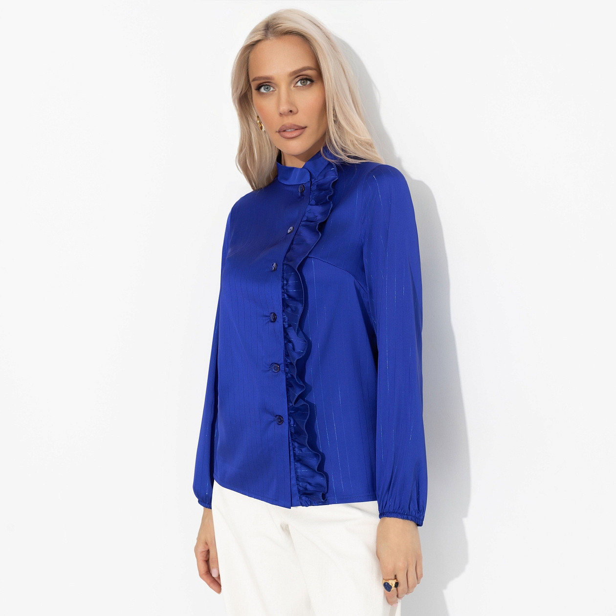 Блуза ЧАРУТТИ — её секретное оружие. Прямое попадание в центр женственности. В ней она чувствует себя одновременно уверенной и нежной. Создает классический голливудский образ в современном прочтении. Мужчины замечают не только её внешнюю элегантность, но и ту загадочную силу, что исходит от безупречного вкуса. Блуза приталенного кроя. Воротник-стойка. Есть декоративная сборка по линии пуговиц. Изделие хорошо смотрится в заправленном виде и навыпуск.