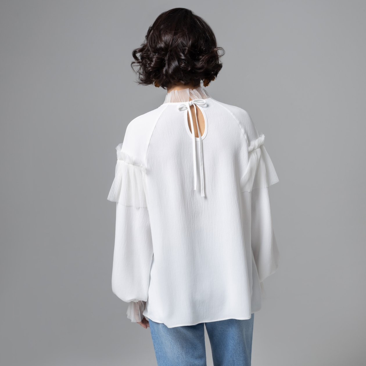 Твой новый образ будто создан пером композитора: мягкий матовый блеск плательной ткани и облако гофрированной сетки звучат в унисон. Полупрозрачные воланы касаются плеч, как такты любимой мелодии, а цветок на груди становится точкой кульминации – тихой, но очень личной. Это не просто белая блуза, а настроение утреннего города и новой энергии. Легкая сетка гофре добавляет объем без тяжести и держит архитектурный силуэт воланов. Аккуратная премиальная обработка швов усиливает ощущение капсульной вещи из ограниченного выпуска.