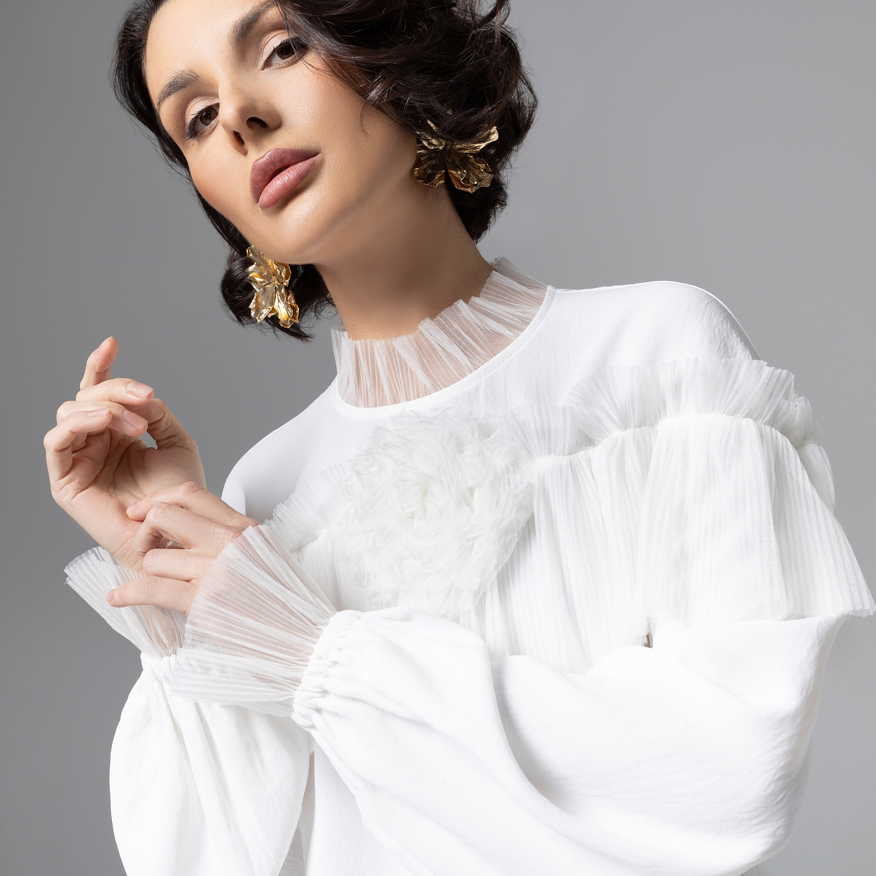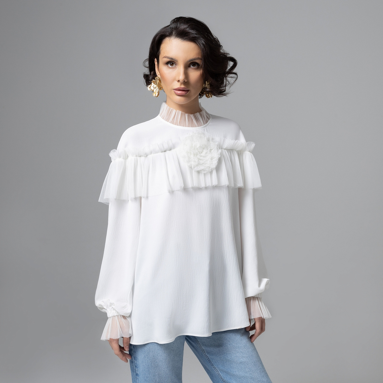 Твой новый образ будто создан пером композитора: мягкий матовый блеск плательной ткани и облако гофрированной сетки звучат в унисон. Полупрозрачные воланы касаются плеч, как такты любимой мелодии, а цветок на груди становится точкой кульминации – тихой, но очень личной. Это не просто белая блуза, а настроение утреннего города и новой энергии. Легкая сетка гофре добавляет объем без тяжести и держит архитектурный силуэт воланов. Аккуратная премиальная обработка швов усиливает ощущение капсульной вещи из ограниченного выпуска.