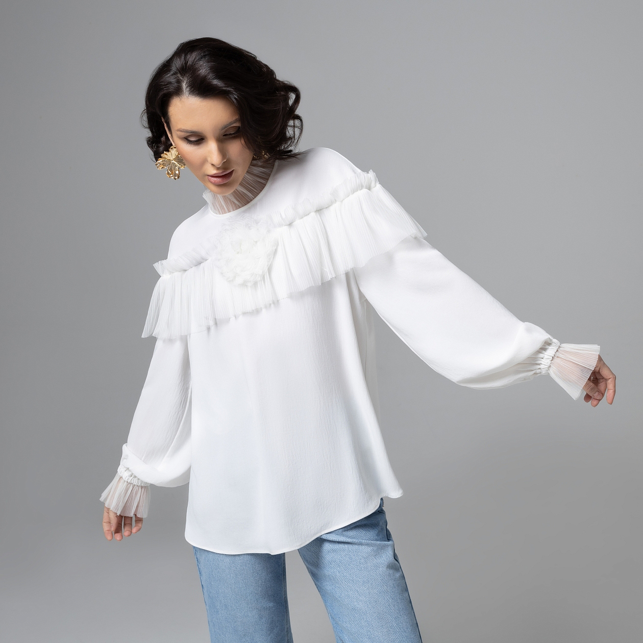 Твой новый образ будто создан пером композитора: мягкий матовый блеск плательной ткани и облако гофрированной сетки звучат в унисон. Полупрозрачные воланы касаются плеч, как такты любимой мелодии, а цветок на груди становится точкой кульминации – тихой, но очень личной. Это не просто белая блуза, а настроение утреннего города и новой энергии. Легкая сетка гофре добавляет объем без тяжести и держит архитектурный силуэт воланов. Аккуратная премиальная обработка швов усиливает ощущение капсульной вещи из ограниченного выпуска.