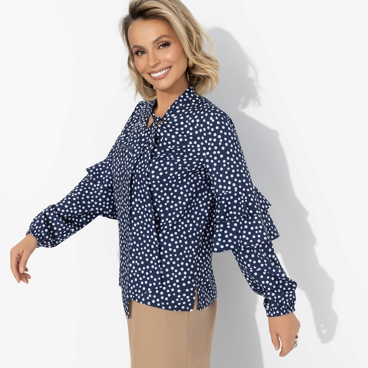 День, проведенный в блузе ЧАРУТТИ, пролетает на одном дыхании. На вдохе утром надеваете, а вечером выдыхаете, вспоминая сколько комплиментов и восхищений вы собрали. Блуза с длинным рукавом. Ворот оформлен аккуратными завязками, можно завязать в бант. Рукава дополнены рюшами. Изделие застегивается на пуговицы. Хорошо смотрится в заправленном виде и навыпуск.