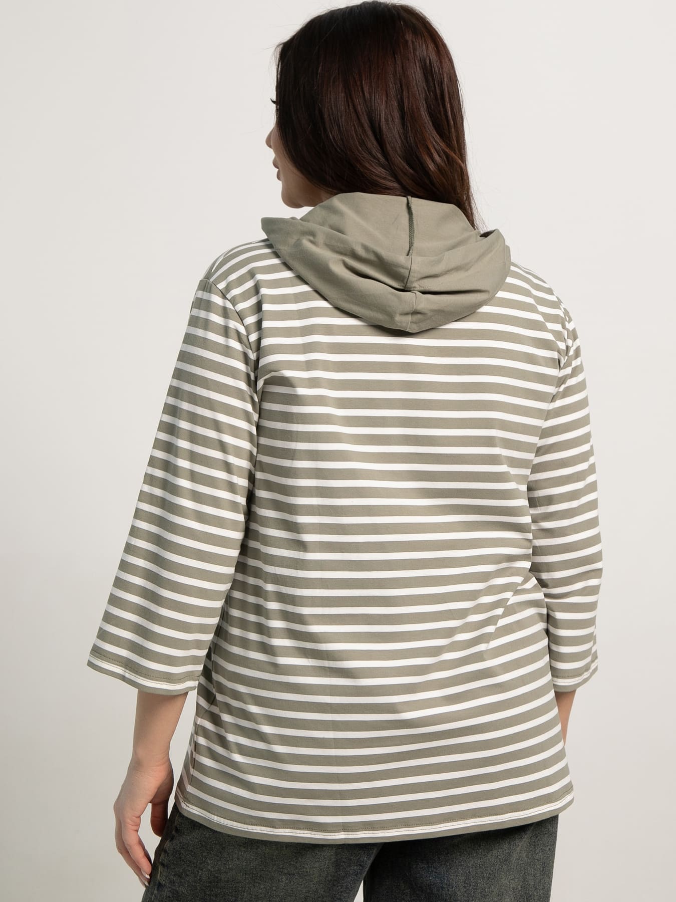 Стильная блуза прямого кроя с втачным рукавом длиной 3/4 отлично подходит для повседневных образов. Горловина украшена капюшоном на затяжке и застежкой-молнией, что придает модели современный и практичный вид. Рукав заканчивается застежкой на пату, создавая интересный акцент. По переднему полотнищу расположены два потайных кармана, добавляющие функциональности. Модель выполнена в зеленую полоску на белом фоне, а представленная цветовая гамма в бело-зеленых оттенках легко сочетается с другими предметами гардероба, делая образ гармоничным и свежим.