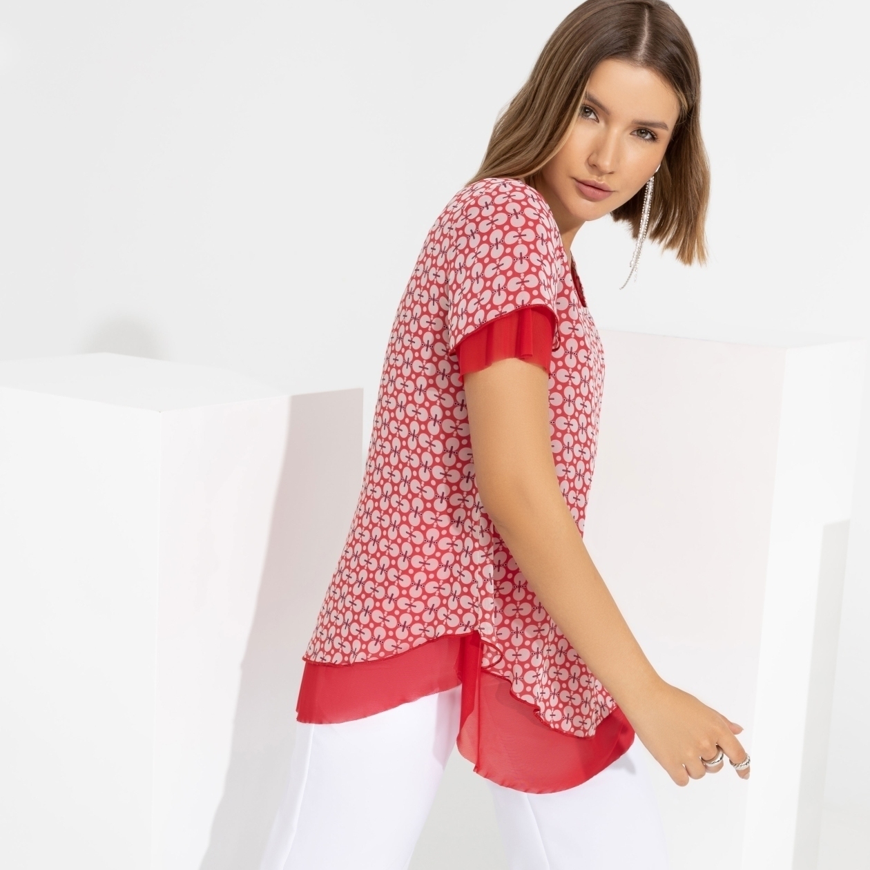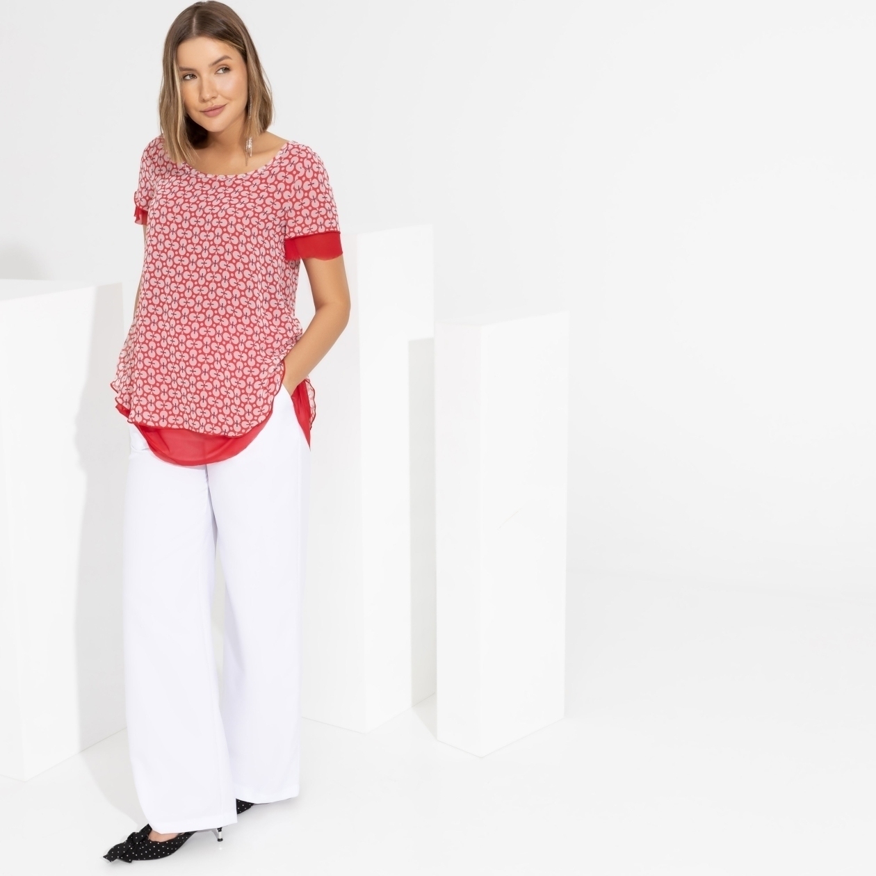 Блуза для поклонниц многослойности: весь аутфит становится гораздо интереснее, благодаря яркому сочетанию двух тканей. Намёк на трендовую полупрозрачность – ведь ты любишь быть заметной.