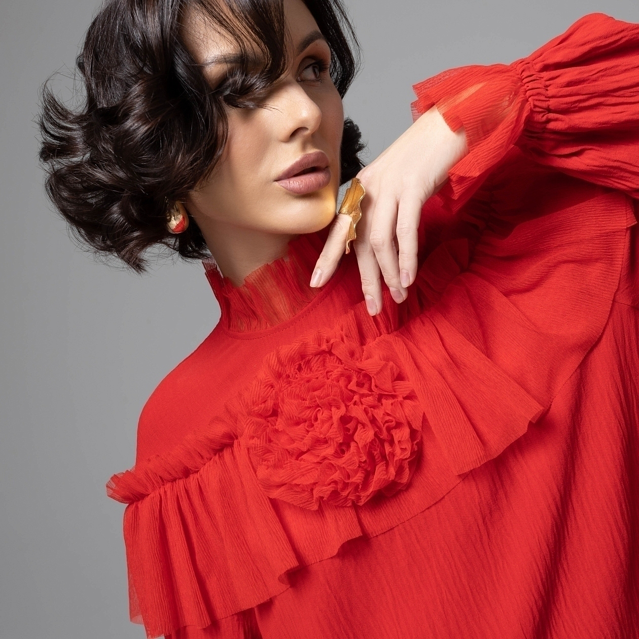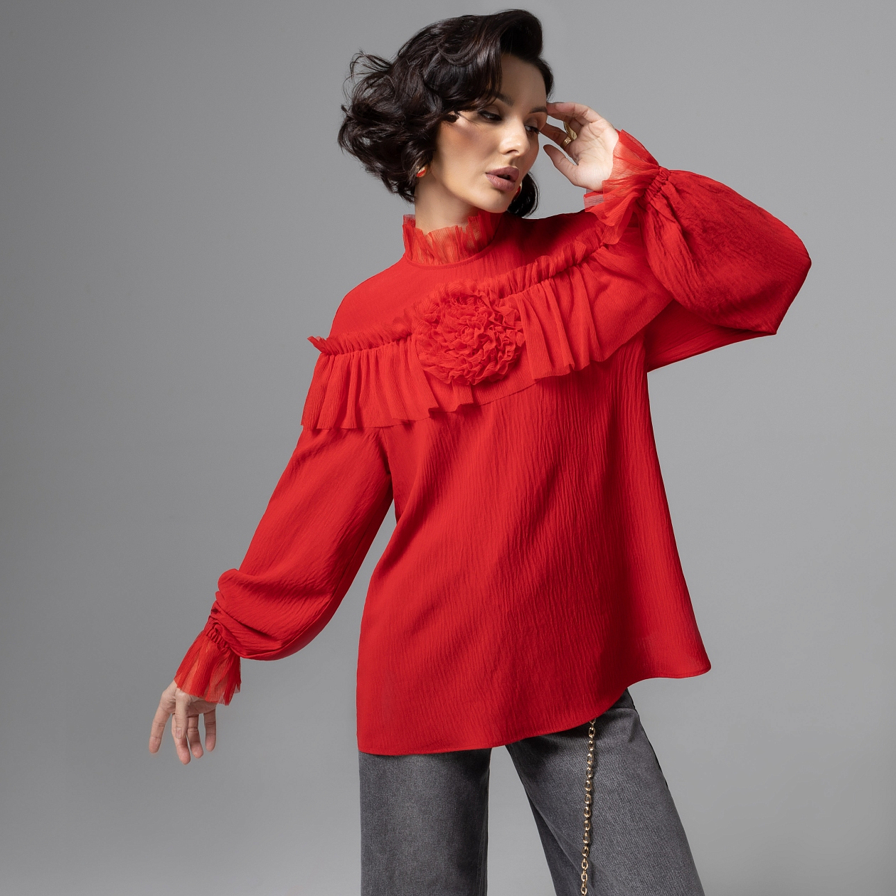 Громче слов: блуза в алом оттенке сразу заявляет о вашей страстной натуре. Гофрированные воланы идут по линии плеч, как взмах испанского веера, а объемный цветок на груди – как роза, брошенная к ногам любви. Один такой акцент в образе, и вы уже не зритель истории, а ее главная героиня. Алый цвет в психологии ассоциируется с жизнью, силой, страстью и смелостью. Легкая сетка гофре добавляет воздушности, чтобы пламя цвета не утяжеляло образ. Изысканная отделка воланов поддерживает атмосферу премиального limited‑дизайна.