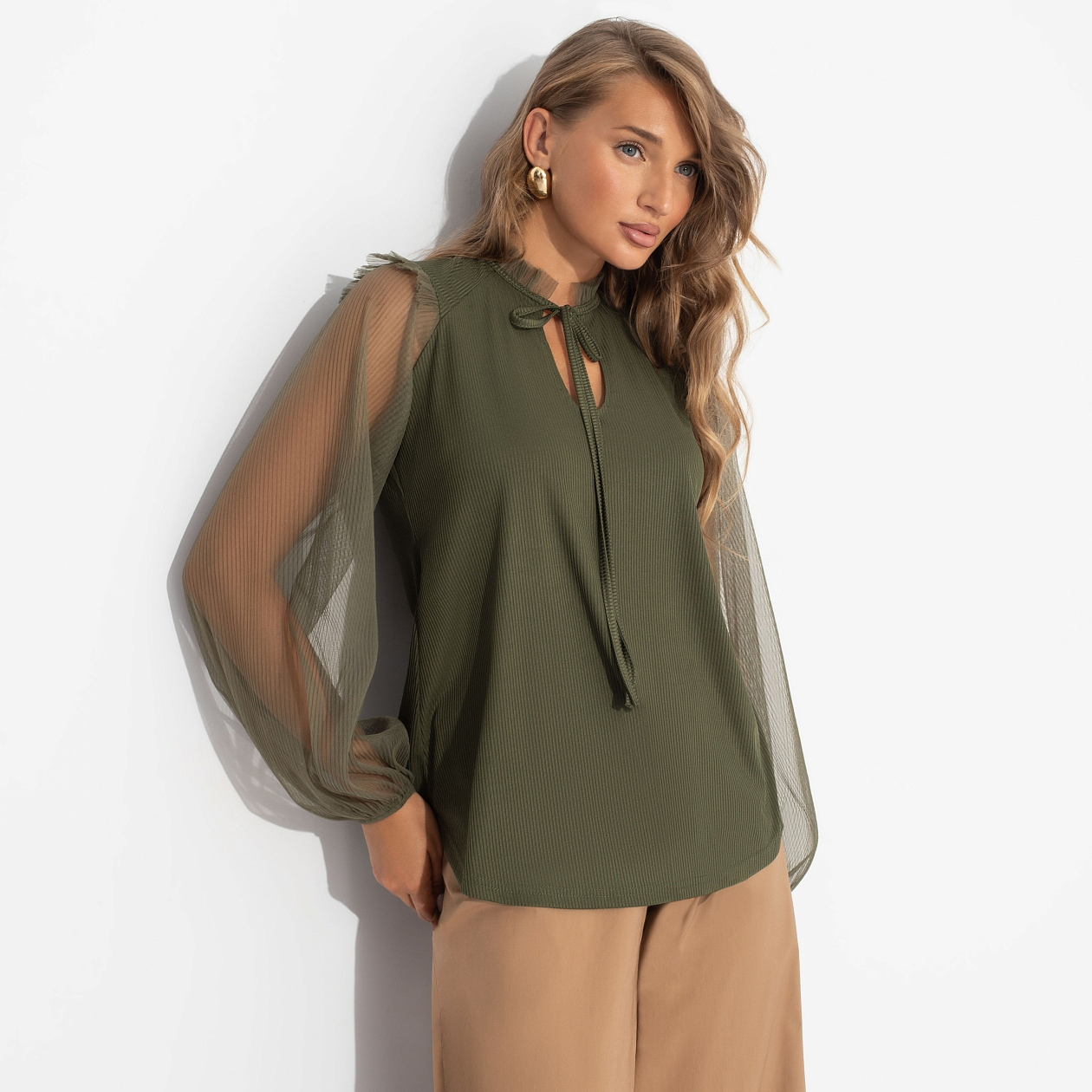 Блуза ЧАРУТТИ в цвете хаки – культовая вещь сезона, которая уверенно заявляет о вашем безупречном вкусе. Трендовый оттенок и милый дизайн делают её must-have базой для создания бесчисленных образов – от строгого офисного лука до дерзкого вечернего ансамбля. Блуза удлиненная свободного силуэта. Рукава выполнены из полупрозрачной сетри-гофре. Ворот дополнен деликатной сборкой. Есть завязки. Изделие хорошо смотрится заправленном виде и навыпуск.