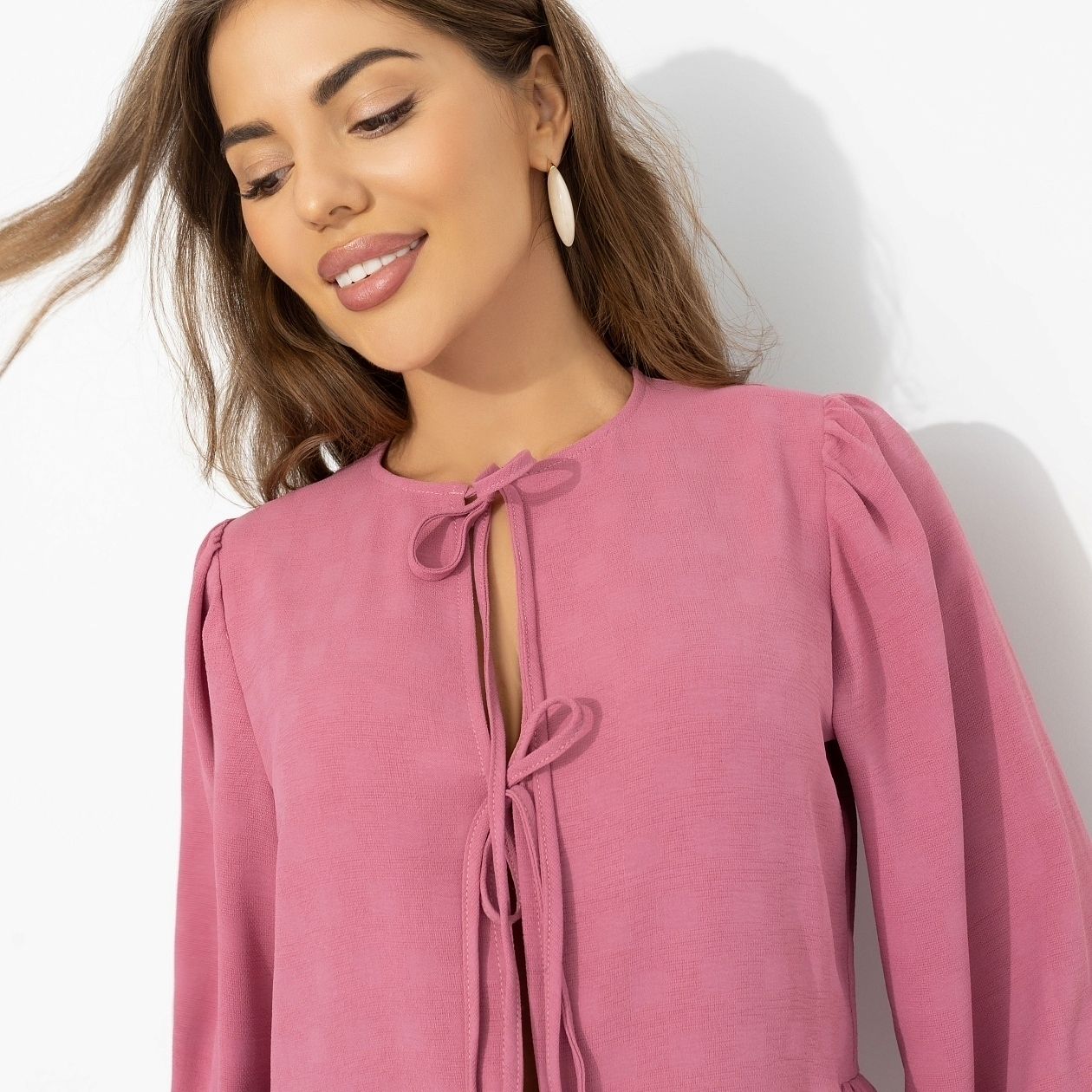 Этот оттенок распускается, как лепесток в тёплом утреннем свете. В нём есть живая цветочность – не наивная, а чувственная, взрослая, с лёгкой нотой флирта. Твой образ будто начинает расцветать прямо в движении. Свободный фасон с мягкой линией талии легко подстраивается под ритм дня, и ты можешь позволить себе лишний кусочек торта. Объёмные рукава усиливают романтичную выразительность.