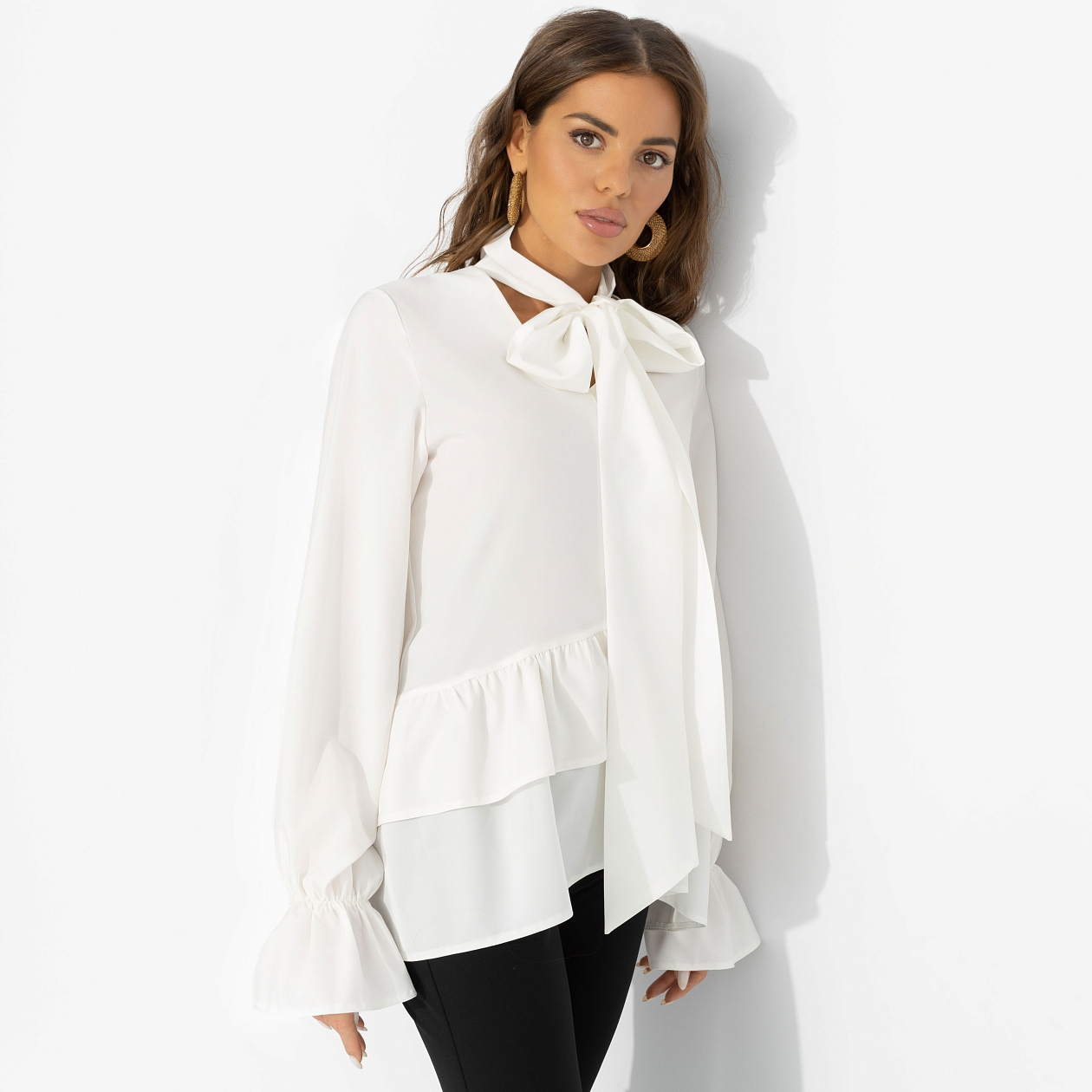Бохо возвращется – но в своей новой, городской версии. Долой мешковатые силуэты, теперь в тренде изящный белый верх с эффектным бантом и свободными рукавами. В такой блузе легко зайти на вернисаж, затем – на концерт в маленьком баре, оставаясь музой для всех, кто ценит искусство и стиль. Лёгкая блуза с длинными рукавами, акцентным воротником-бантом и мягкой баской у линии бёдер создаёт струящийся силуэт. Сочетается и с широкими брюками, и с джинсами, добавляя в образ тот самый богемный штрих.