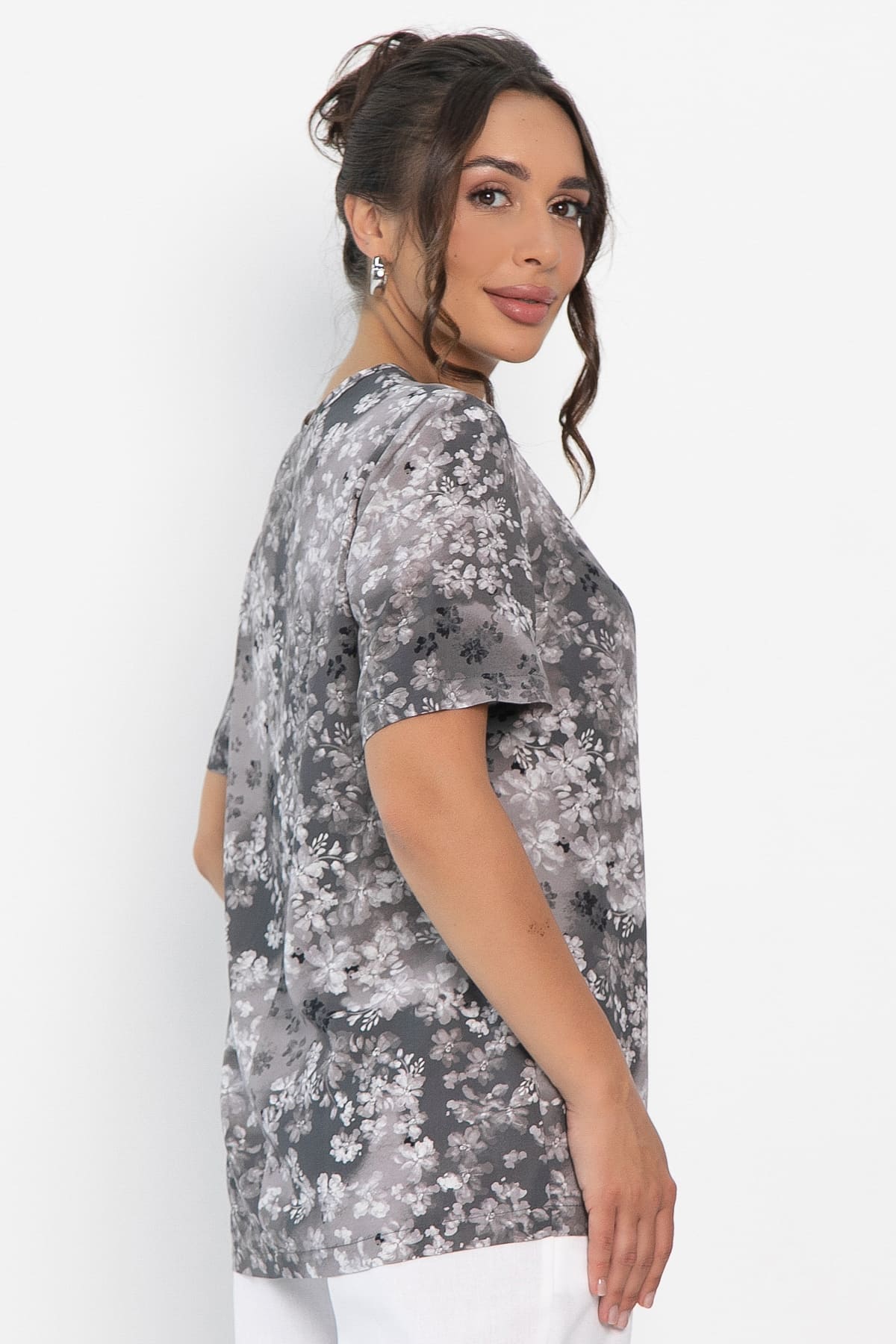 Серая женская блузка с цветочным принтом — стильный и универсальный элемент гардероба. Втачной рукав и прямой крой обеспечивают комфорт и идеальную посадку по фигуре. Горловина с обработанной окантовкой добавляет аккуратности и завершает образ. Легко сочетается с разными вещами, подчеркивая женственность и уверенность.