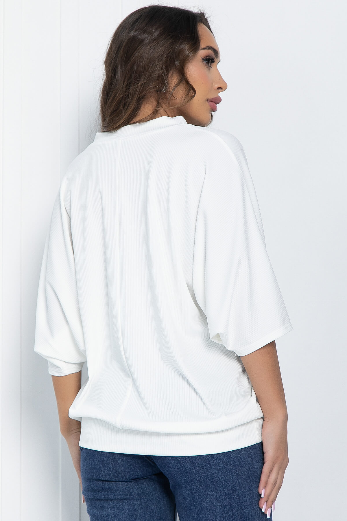 Блуза имеет интересный дизайн с V-образным вырезом горловины и удобным цельнокроеным рукавом «летучая мышь» длины ¾ . Важное преимущество такого рукава заключается в его способности скрывать различные погрешности фигуры. Обладая женственной привлекательностью, подойдет к классической офисной и к деловой повседневной одежде.