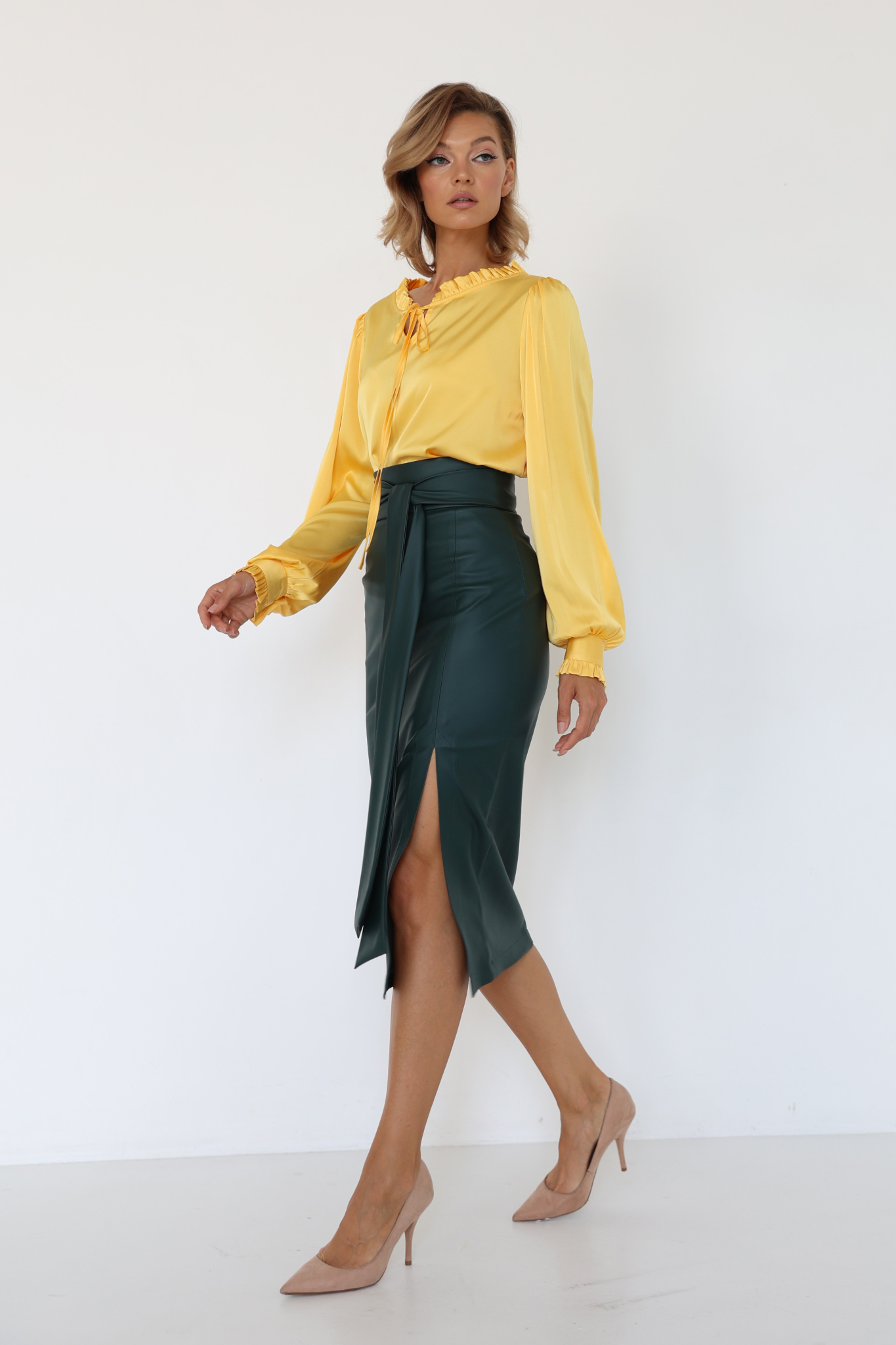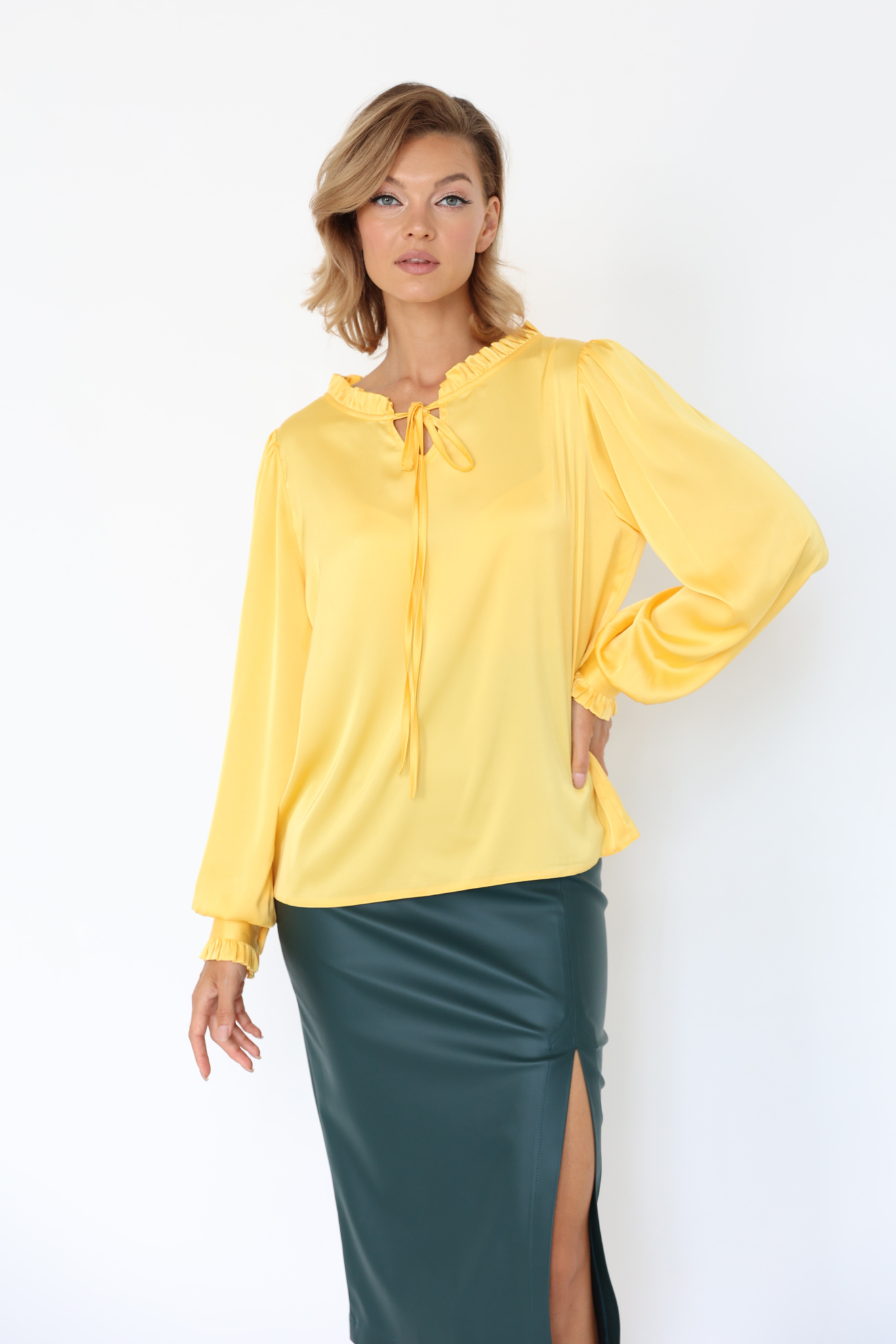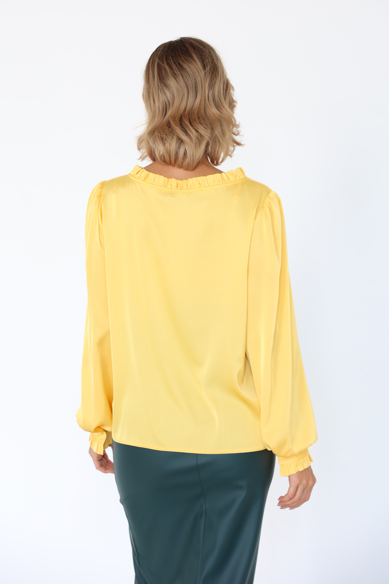 Блузка с круглым вырезом горловины, завязками и рюшей. Втачной рукав со сборкой по окату манжета и рюша по низу рукава.