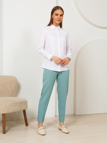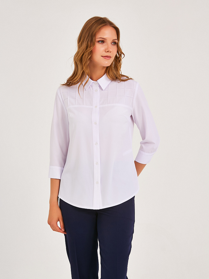 Модель с кокетками. На кокетках переда застрочены вертикальные и горизонтаьные складки. Под кокеткой спинки заложена складка. По низу рукава разрез, защип и манжета с застёжкой на петлю и пуговицу. В боковых швах разрезы. Низ блузы закруглён.