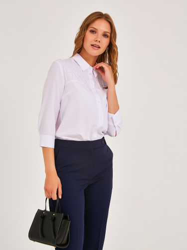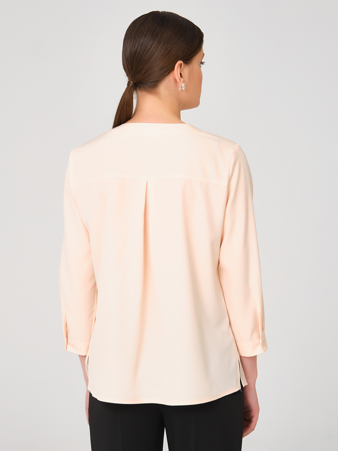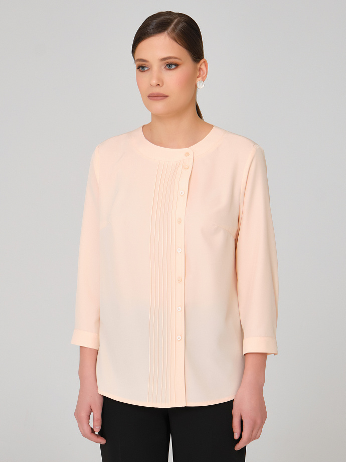 Спереди группа вертикальных застроченных складок и смещённая застёжка на петли и пуговицы. Спинка с кокеткой, под кокеткой складка. Округлый вырез горловины подчёркнут планкой. По низу рукава разрез, защип и узкая манжета с застёжкой на пуговицу. В боковых швах разрезы.