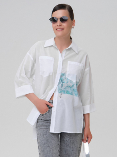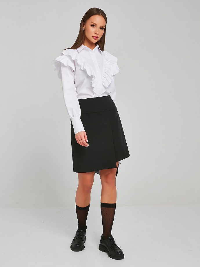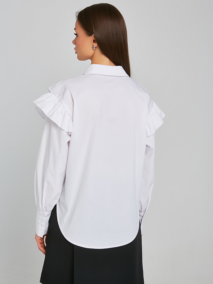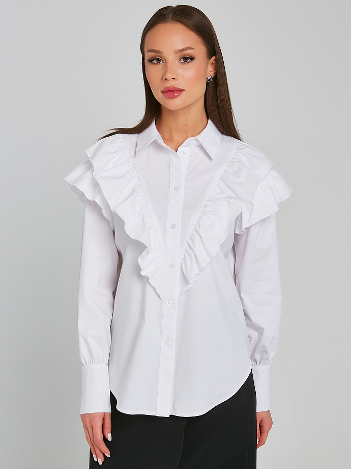 Спереди наклонные кокетки и планка с застёжкой на петли и пуговицы. По низу рукава сборка, разрез и широкая манжета с застёжкой на пуговицы. Низ блузы закруглён.