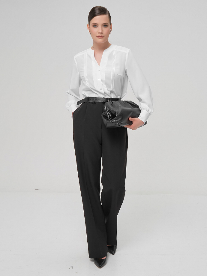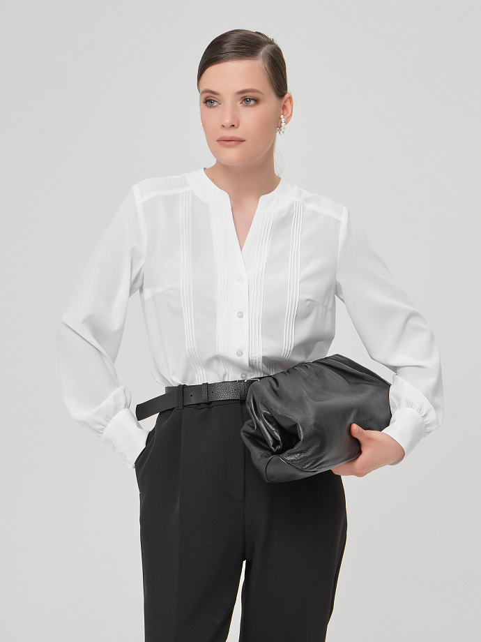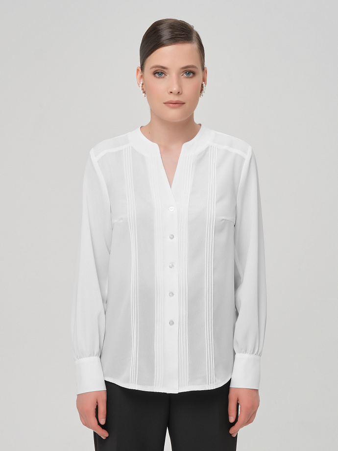 Модель прямого силуэта, с кокетками. По переду и спинке застрочены группы складок. Спереди V-образный вырез и  застёжка на петли и пуговицы. Воротник стойка. По низу рукава разрез, сборка и нанжета с застёжкой на пуговицы. В боковых швах разрезы. Низ блузки закруглён.