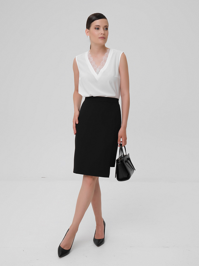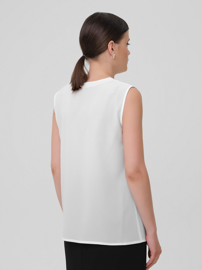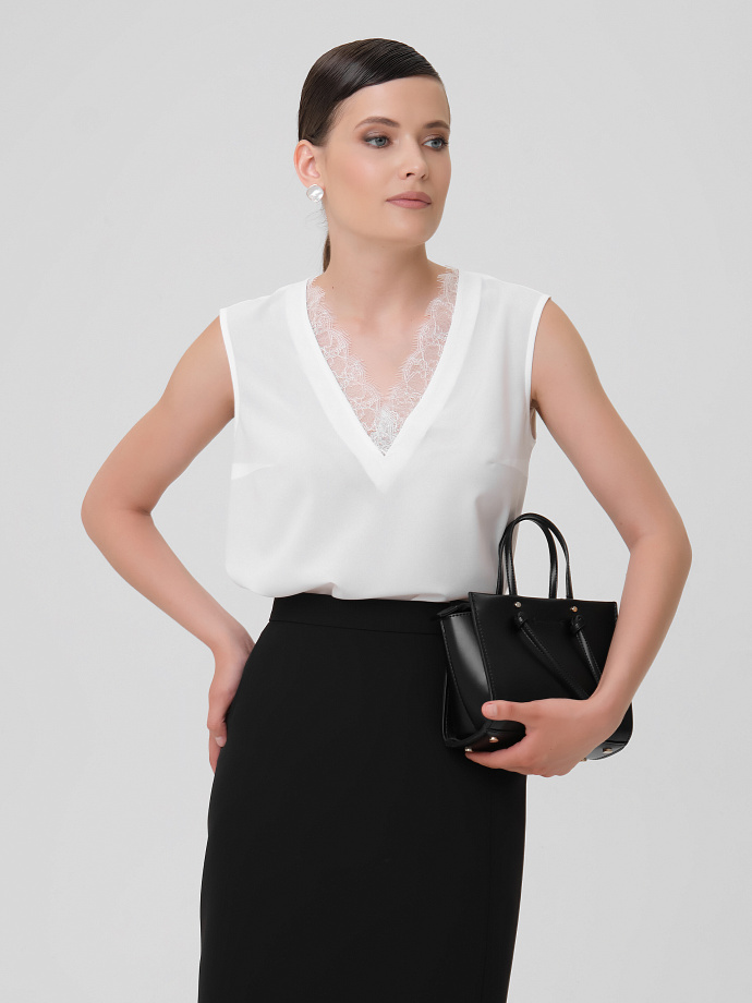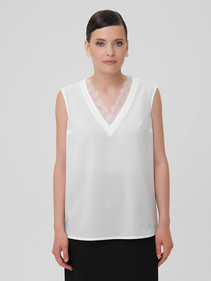 Модель прямого силуэта, без рукавов, с V-образным вырезом горловины, декорированным кружевом.