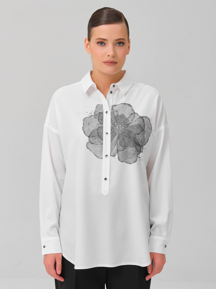 Модель прямого силуэта, со спущеным плечом. Спереди планка с застёжкой на петли и пуговицы. Спинка с кокеткой, под кокеткой скдадка. Воротник сорочечный. По низу рукава разрез, защип и манжета с застёжкой на пуговицу. В боковых швах разрезы. Низ блузки разноуровневый, длиннее по спинке, закруглён.
