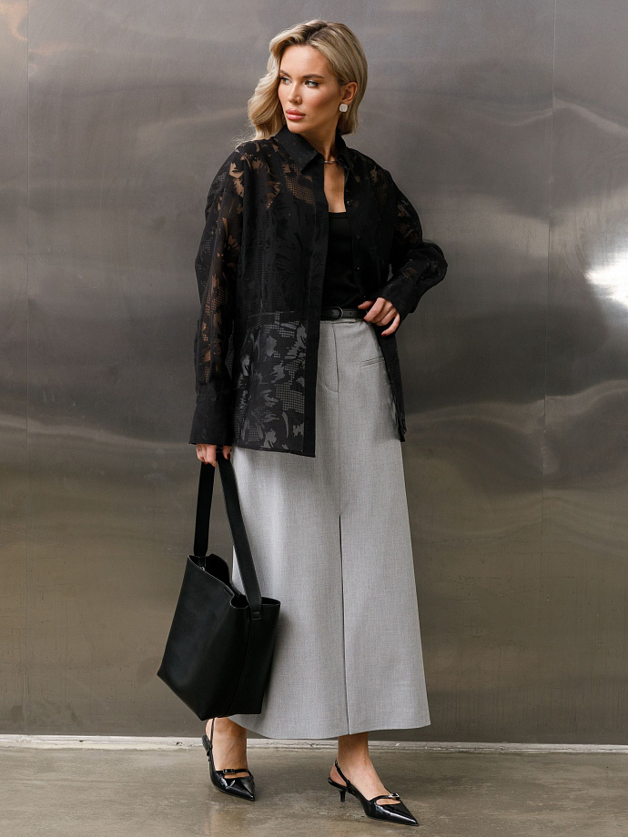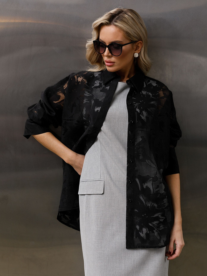 Модель прямого силуэта, со спущенным плечом. Спереди потайная застёжка на петли и пуговицы. В среднем шве спинки обработаны разрезы. Воротник сорочечный. По низу рукава защипы, планка и манжета с застёжкой на пуговицу. В боковых швах разрезы.