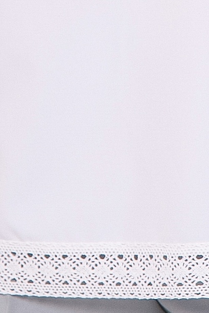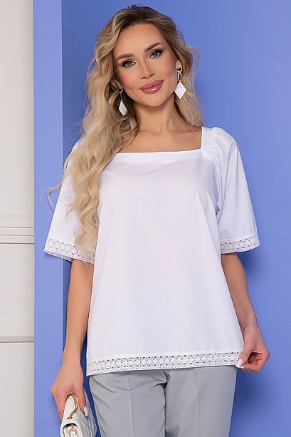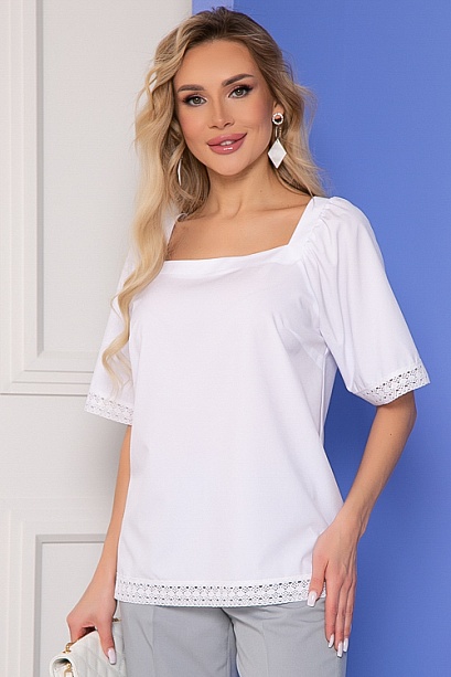 Блузка из текстильного полотна с вырезом каре.По низу изделия и рукавам отделка плетеным кружевом.