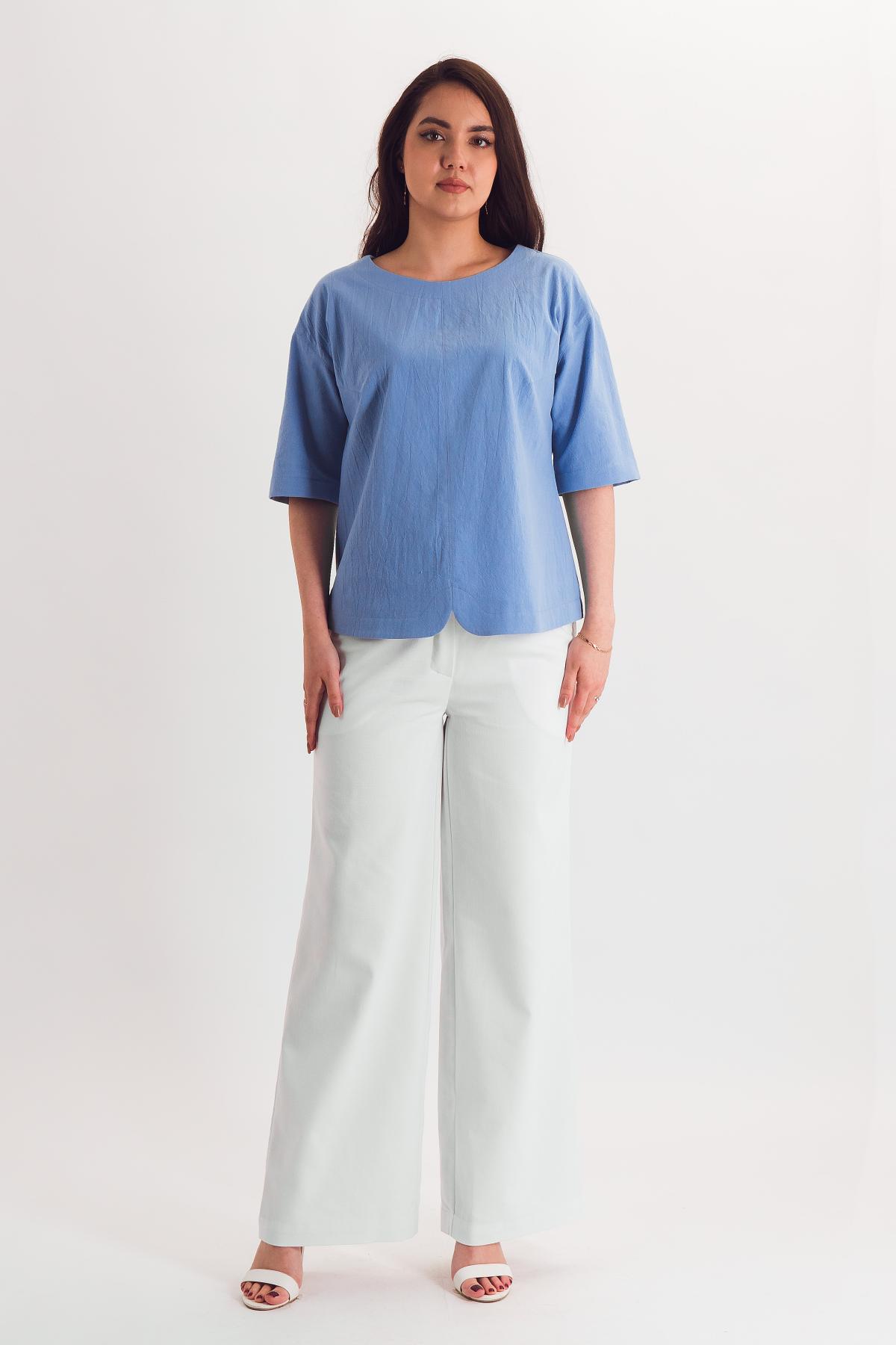 Описание: Лаконичная блузка прямого силуэта со спущенным плечом. Акцентный низ выделен отделочной строчкой, повторяющейся по горловине и низу рукавов.