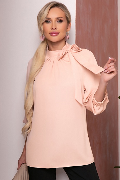 Блузка из текстильного полотна свободного силуэта с рукавами реглан,со сборкой от горловины и воротником стойка  застегивающимся на потайную пуговицу и переходящим в шарф.
