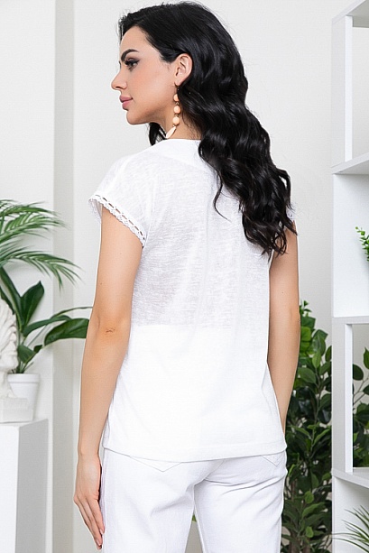 Блузка из трикотажного полотна с V-вырезом горловины и отделкой плетеным кружевом.