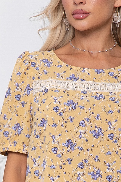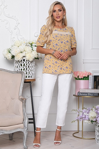 Блузка из текстильного полотна свободного силуэта по полочке украшена плетеным кружевом.