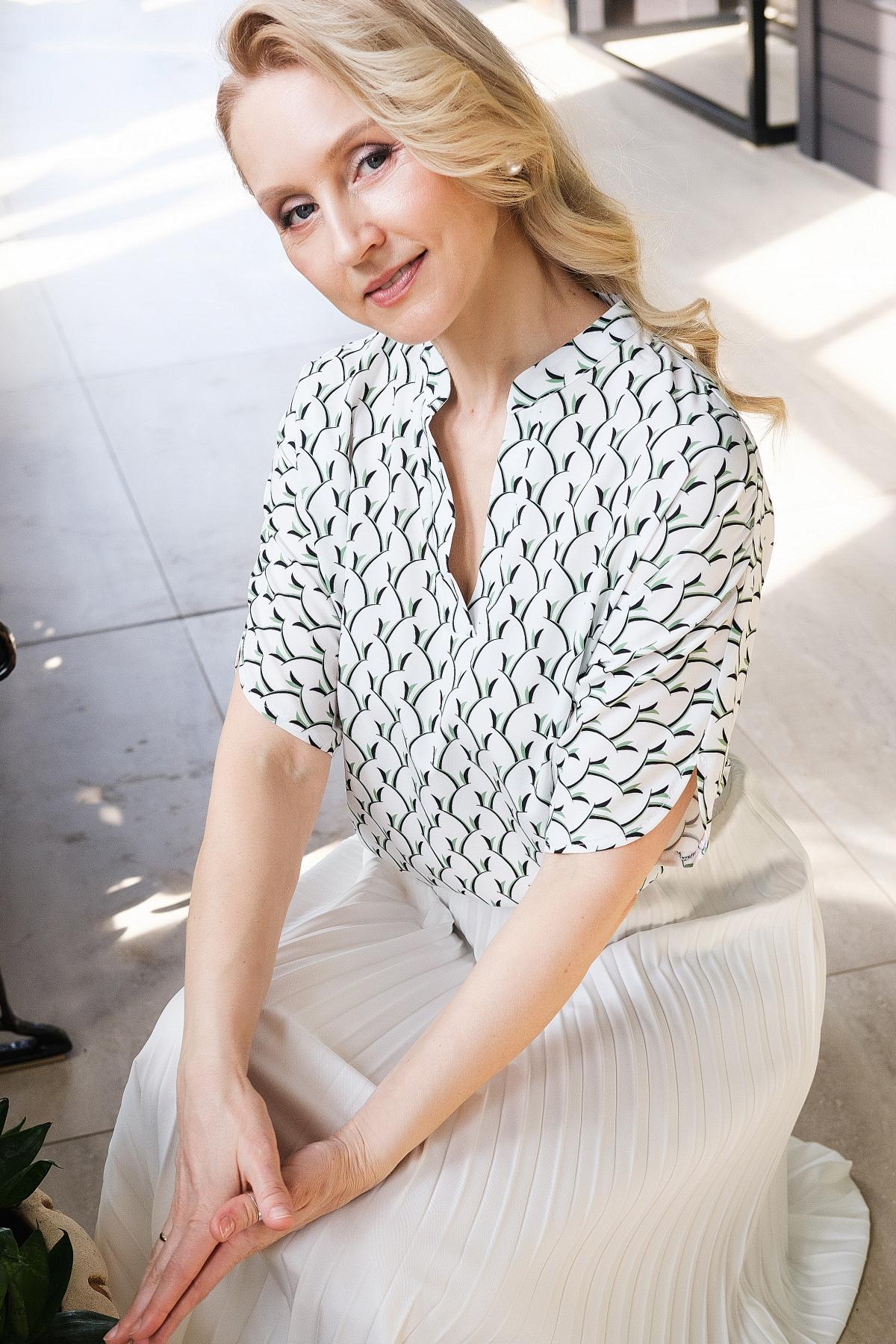 Описание: Свободная блузка со спущенным плечом дарит комфорт движений и стильный образ! Неглубокий V-образный вырез с планками, горловина оформленая стойкой небольшие закругленные разрезы по плечевым и боковым швам.