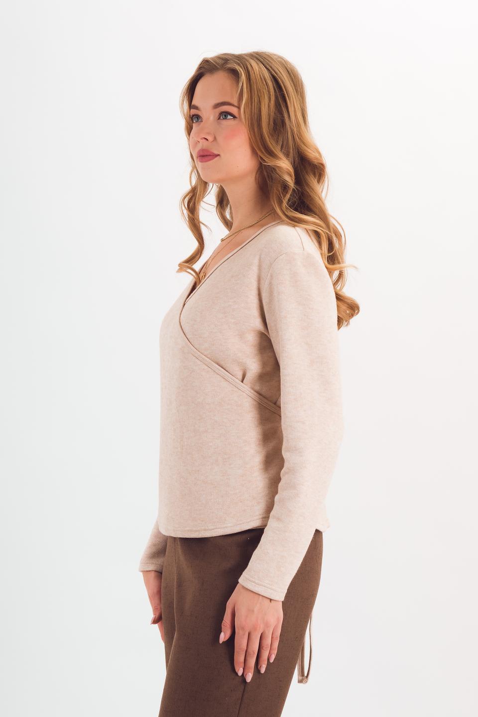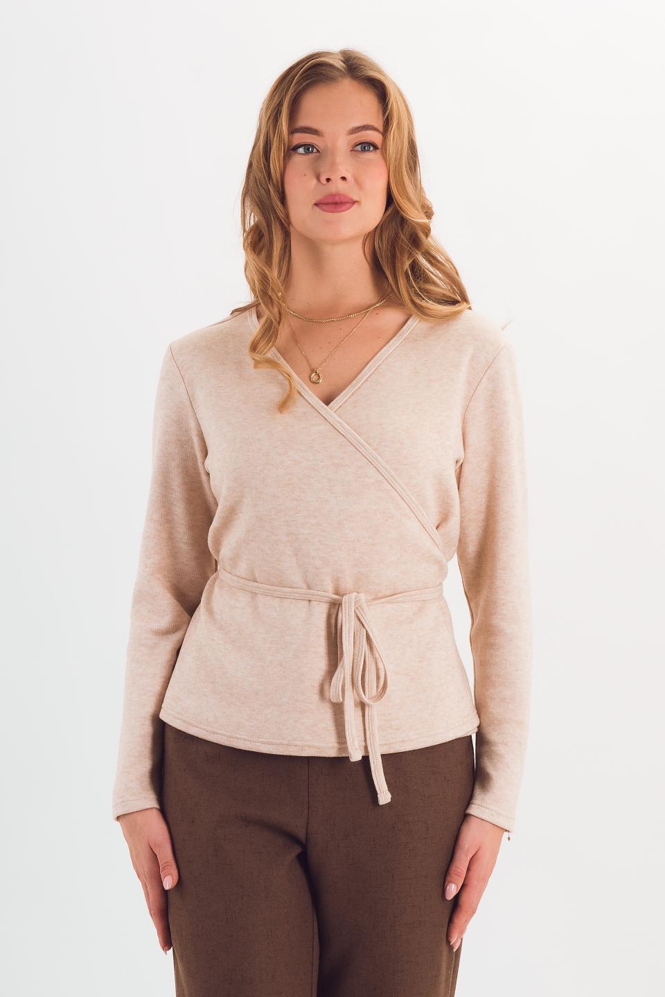 Описание: Мягкая и удобная трикотажная блузка на запах хорошо садится на фигуру. Длинные завязки элегантно подчеркивают талию.