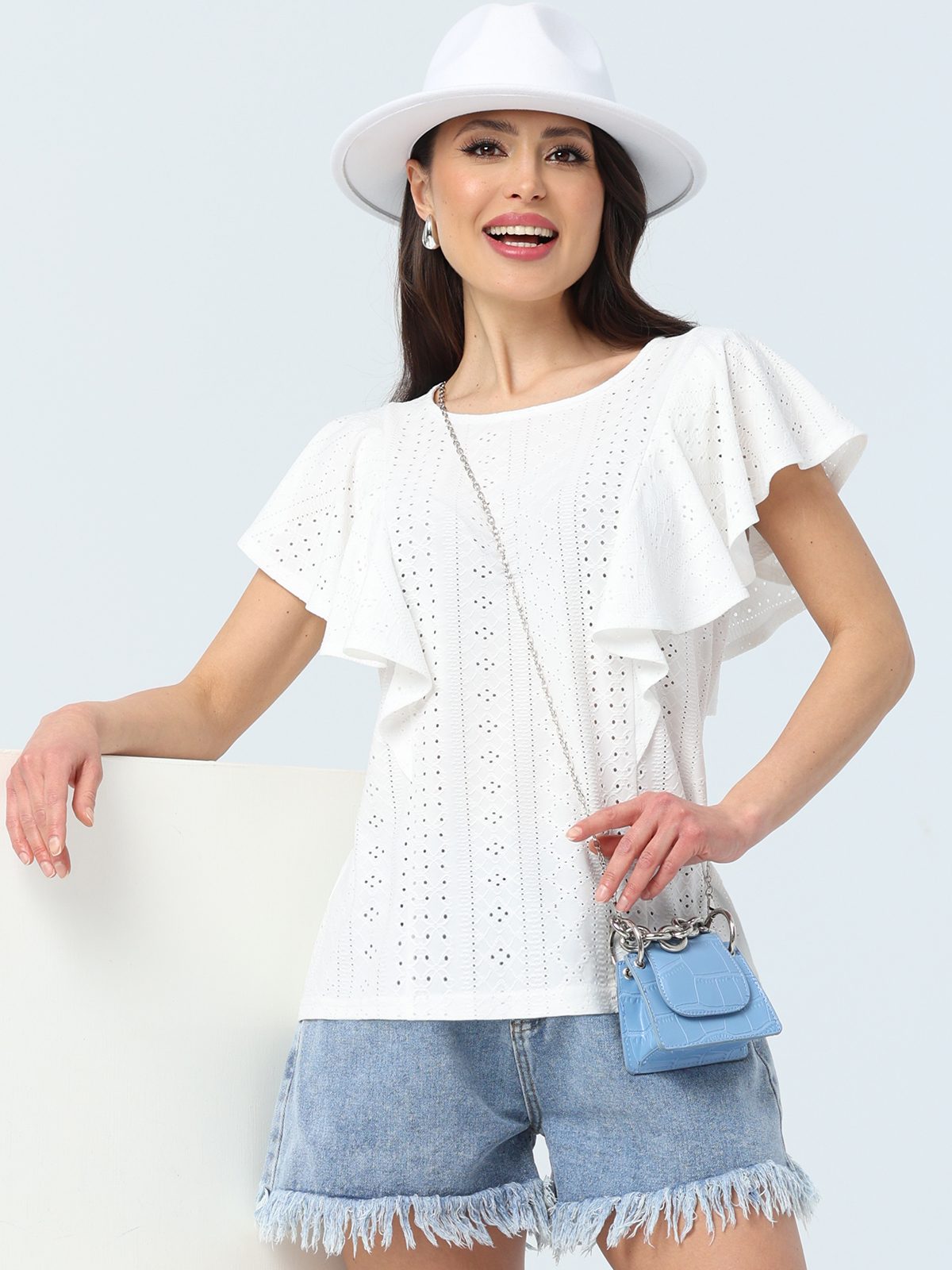 Романтичная блузка выполнена из трикотажной ткани, которая обеспечивает легкость, комфорт и эластичность при носке. Модель подходит для летнего сезона благодаря воздушному дизайну и воланам вместо рукавов, что добавляет образу женственности и изящества. Блузка универсальна и может быть использована как для повседневной носки, так и для офисного стиля при сочетании с подходящими элементами гардероба. Изделие доступно в больших размерах, что делает его подходящим для разных типов фигур. Уход за блузкой прост: бережная стирка при температуре 30 градусов сохраняет её форму и качество ткани. Лаконичный и романтичный дизайн делает эту блузку стильным дополнением к летнему гардеробу.