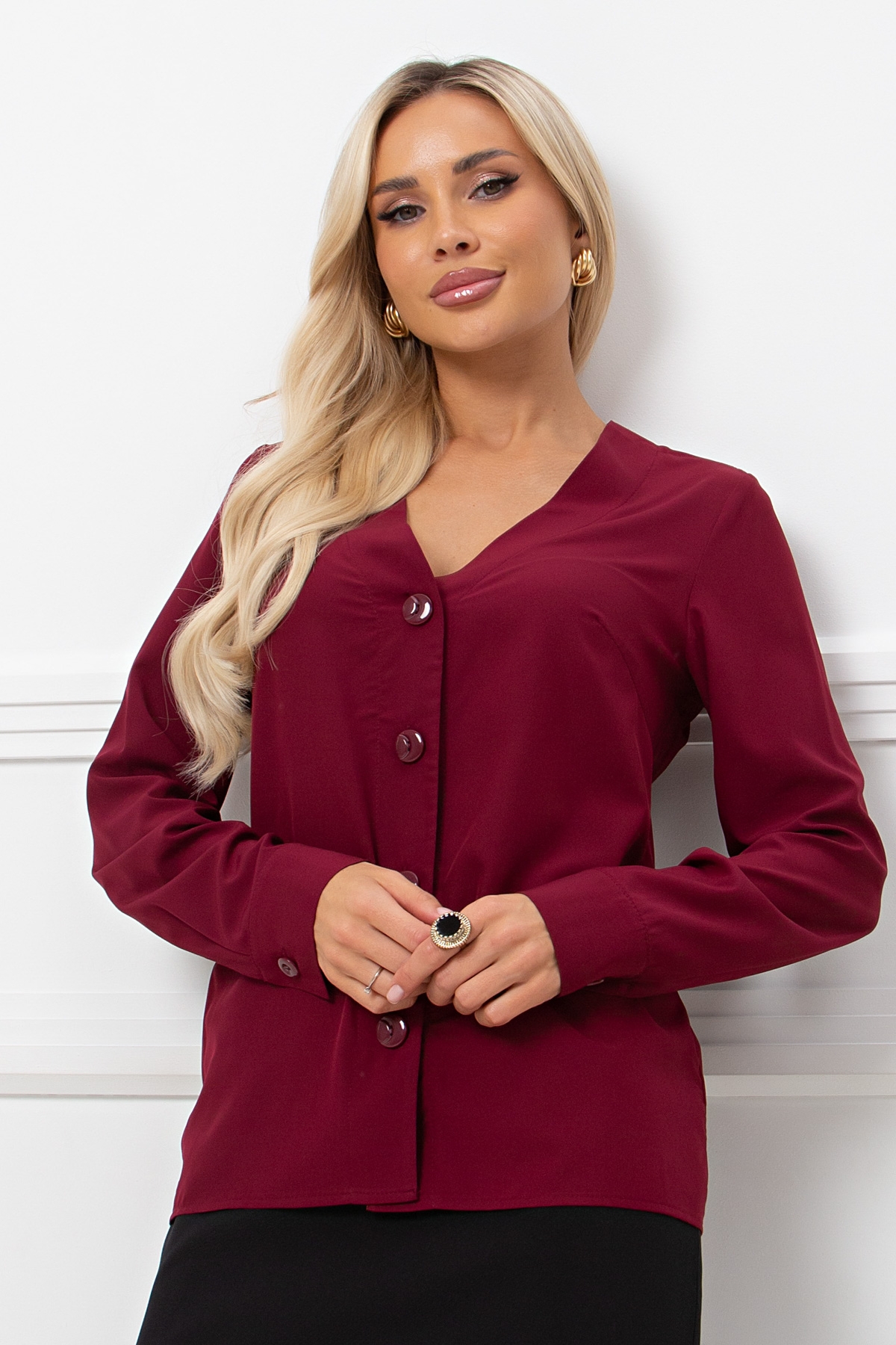 Легкая блузка прямого кроя. V - образная горловина. По переду застежка на петли и пуговицы. Длинные втачные рукава, оканчиваются притачной манжетой. Низ ровный, без разрезов.