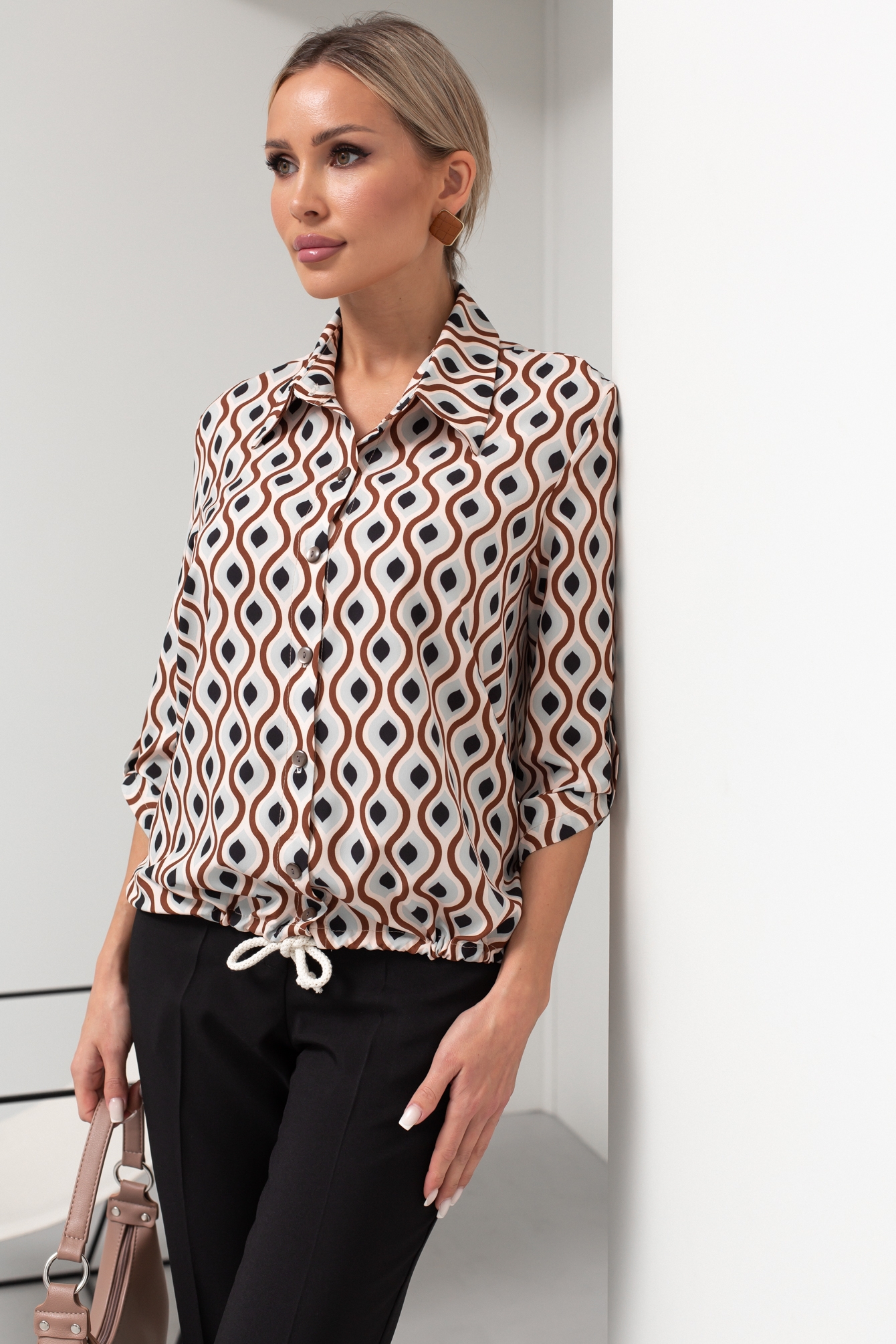 Красивая блузка прямого кроя из легкой ткани - Ниагара. Втачной рукав длинной 3/4 присобран на паты. Горловина оформлена воротником на стойке переходящим в планку с застежкой на пуговицы. Низ ровный, на кулиске. Идеальная основа для создания образа.