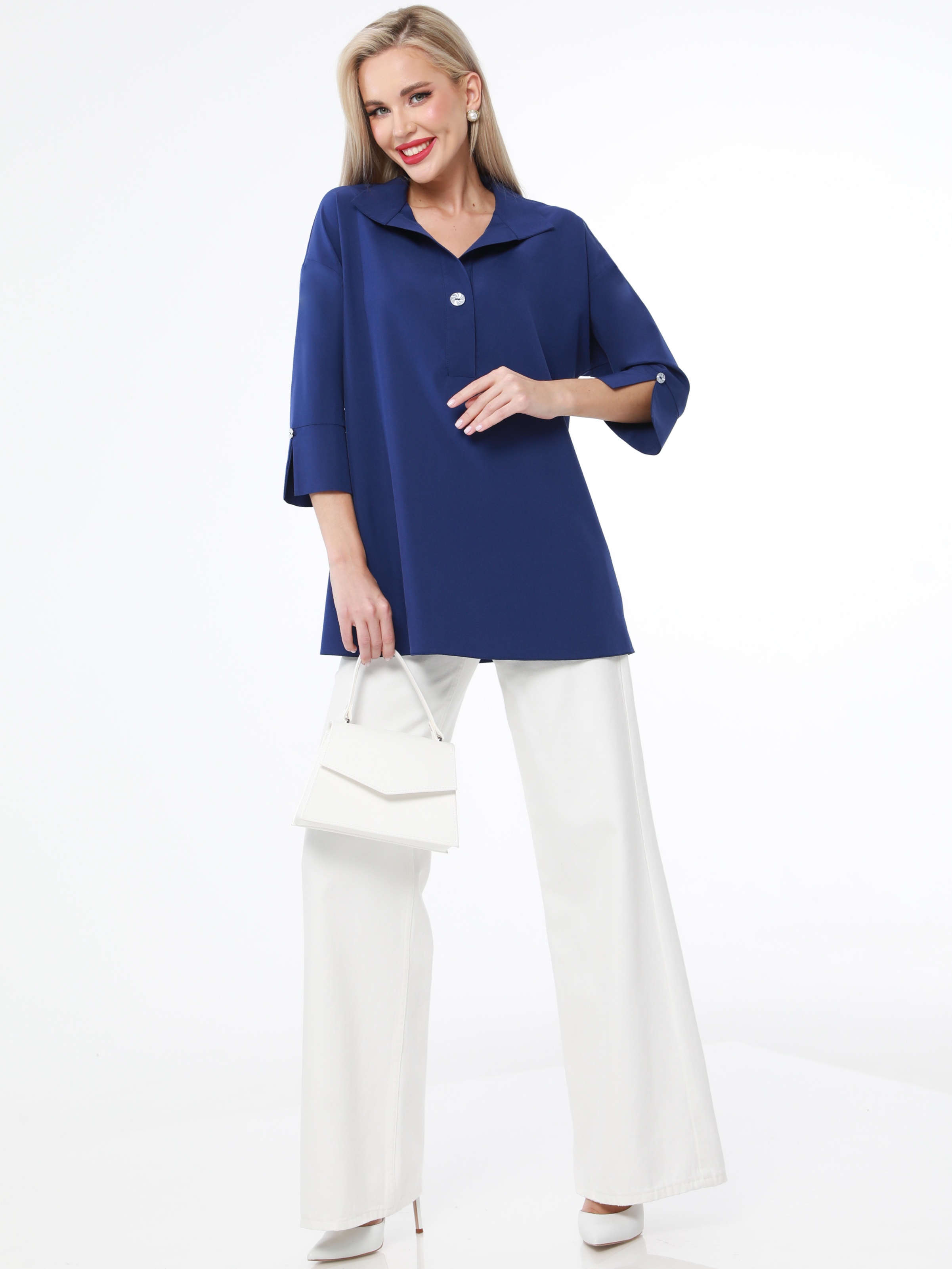 Блузка свободного кроя с декоративными пуговицами — находка для женщин, которые ценят стиль и комфорт. Модель без лишних деталей будет прекрасно смотреться как на модницах стандартной комплекции, так и на обладательницах пышных форм. Рубашечный воротник задает элегантный деловой тон, а V-образный вырез визуально удлиняет шею и стройнит. Изящные рукава длиной ¾ с небольшими разрезами приоткрывают тонкие запястья и позволяют дополнить образ наручными украшениями. Нарядным завершением модели становятся пуговицы с металлическим блеском, которые украшают и освежают. При желании объемную блузку всегда можно заправить или дополнить ремешком, чтобы создать привлекательный акцент на талии и подчеркнуть женственность. Модель выполнена из качественной приятной к телу ткани, которая не просвечивает и прекрасно переносит стирку в деликатном режиме при температуре до 30 градусов.