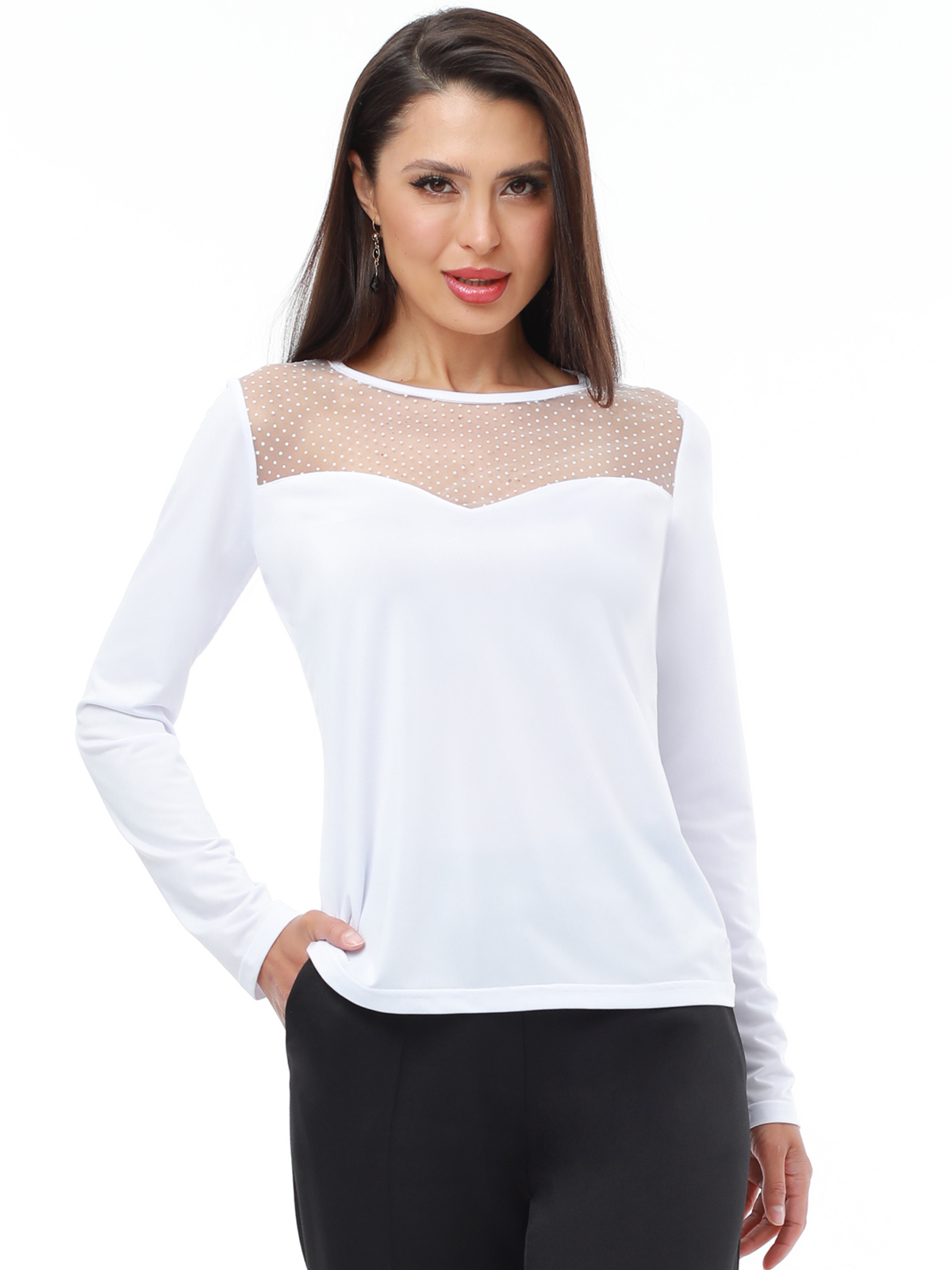 Эффектная блузка с длинными рукавами — соблазнительная модель, которая преобразит как повседневный, так и вечерний образ. Облегающий фасон красиво подчеркивает женственные изгибы тела, а нежная, эластичная ткань «масло» позволяет чувствовать себя комфортно в течение всего дня. Прозрачная сетчатая кокетка создает акцент на изящной линии плеч и декольте, придает образу пикантности и точно окажется в центре внимания. Универсальная длина позволяет носить трикотажную блузку как в заправленном виде, так и навыпуск. Дополните топ акцентной юбкой с блеском для торжественного выхода, а жакет и брюки станут идеальным сочетанием для повседневных встреч. Чтобы модель долго радовала вас красотой и качеством, рекомендуется стирать ее в деликатном режиме при температуре до 30 градусов и сушить в расправленном виде на плечиках.