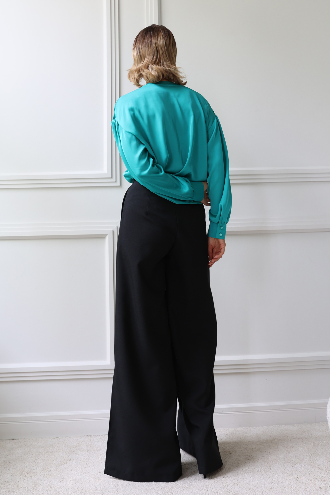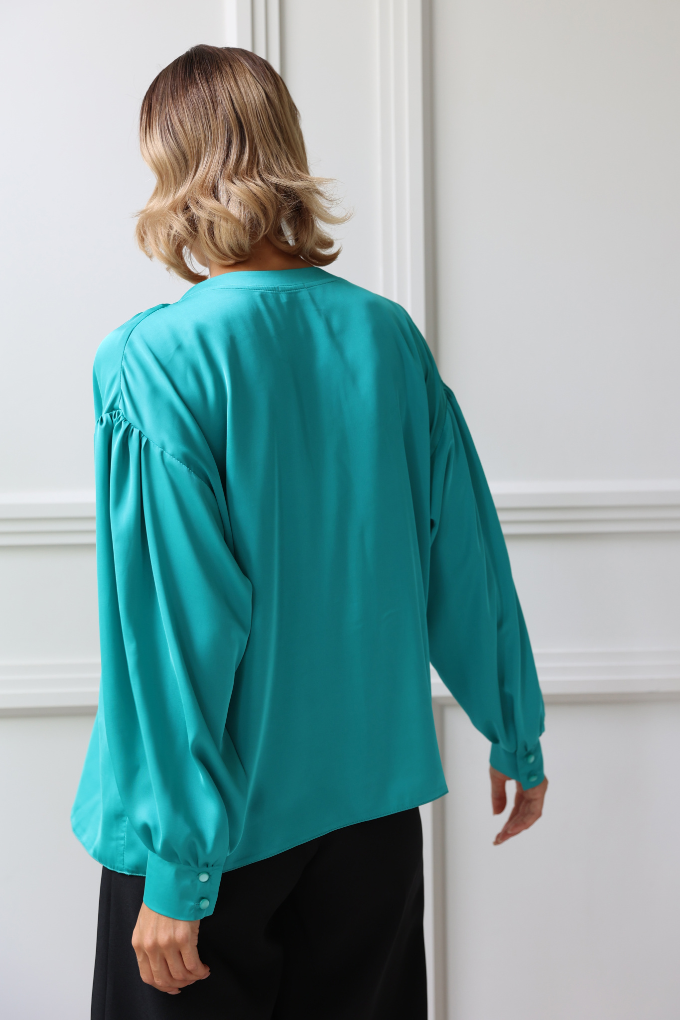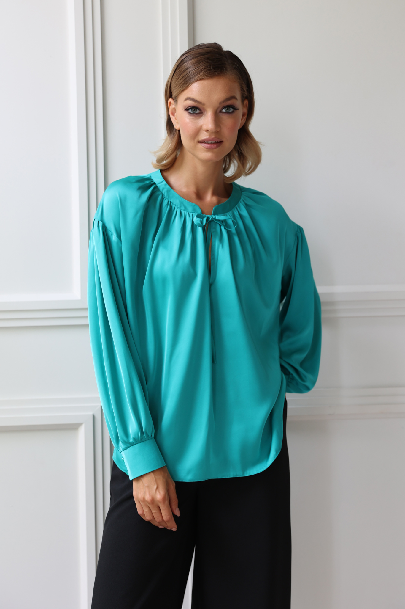 Блузка свободного кроя из искусственного шелка с круглым вырезом горловины и завязками. Спущенная линия плеча, втачной рукав со сборкой по окату, манжета, застегивающаяся на 2 пуговицы.