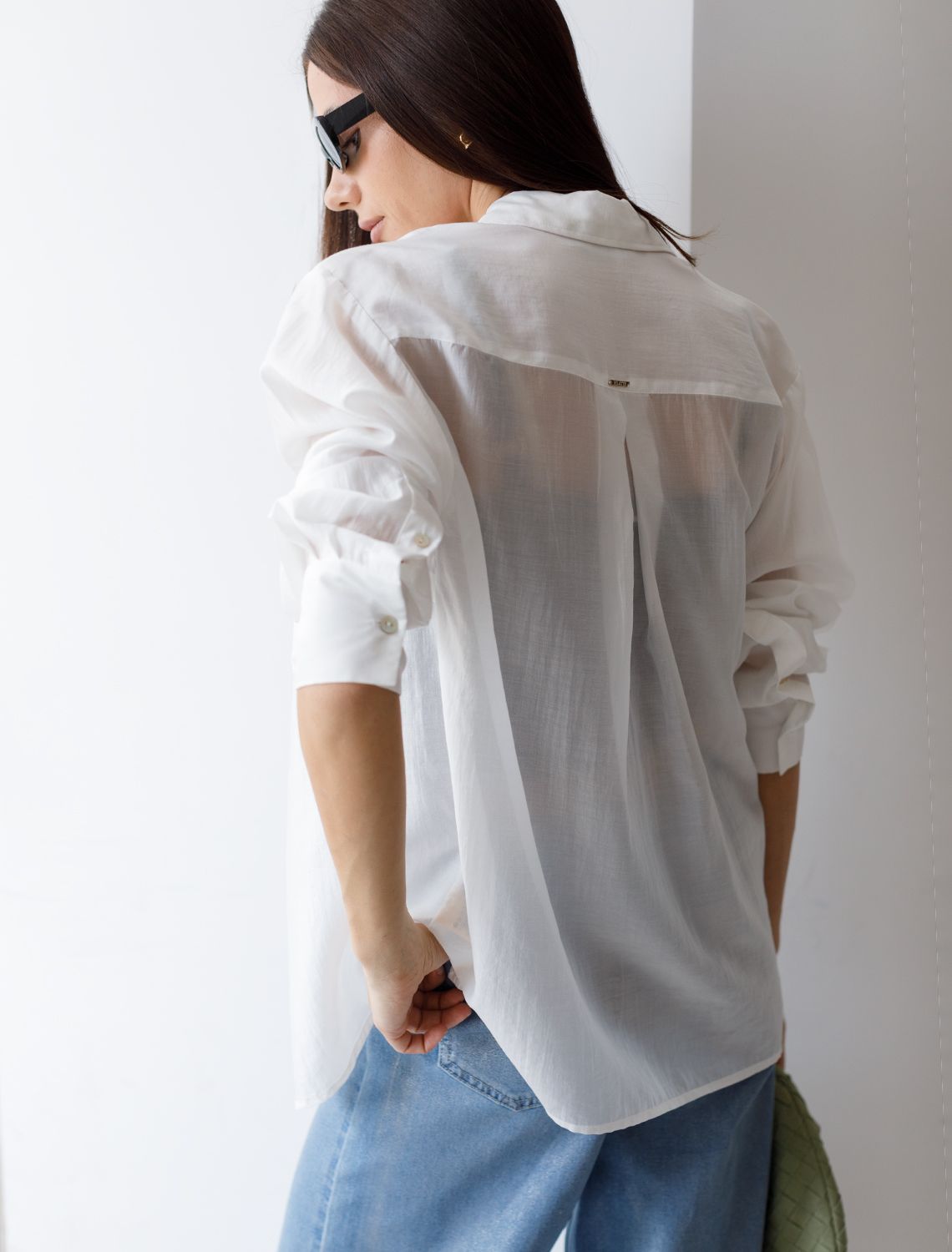 Блузка выполнена из полупрозрачного лиоцелла с эффектом шелка. Легкая и почти невесомая модель, приятно ощущается на теле. Застежка на пуговицы из натурального перламутра, подчеркивает роскошь.
