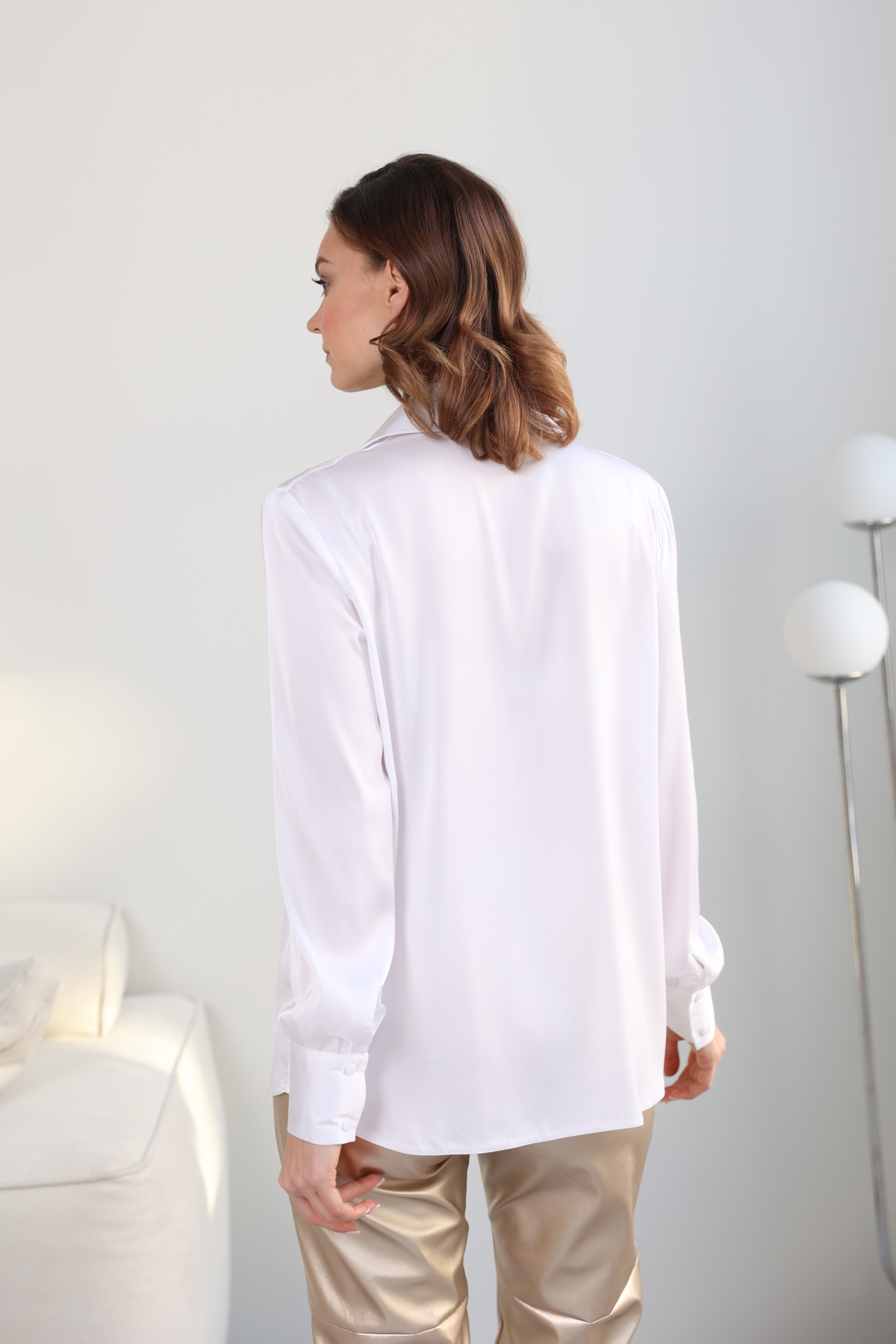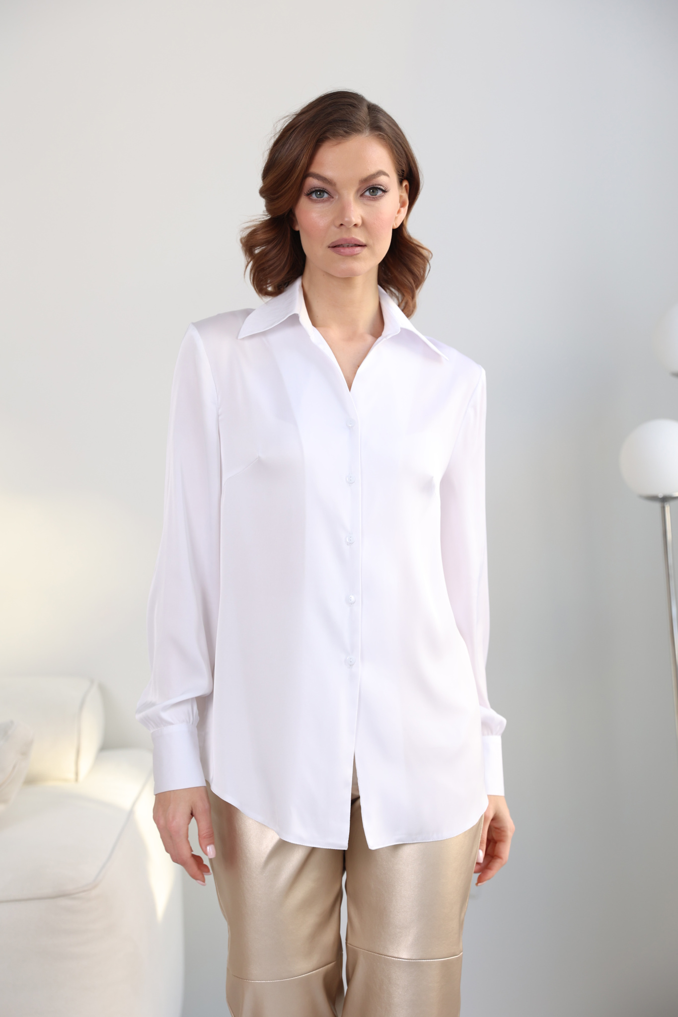 Блузка прямого кроя с отложным воротом. Втачной, длинный рукав на высокой манжете.
