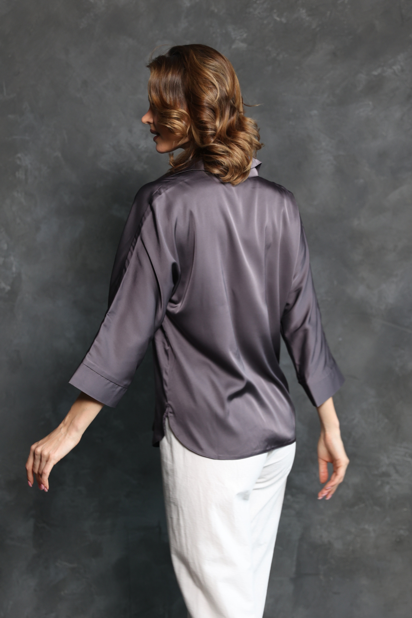 Блузка прямого кроя с полукруглым низом. Ворот с V-вырезом и отложным воротом. Широкий, втачной рукав длиной 7/8 с манжетой.