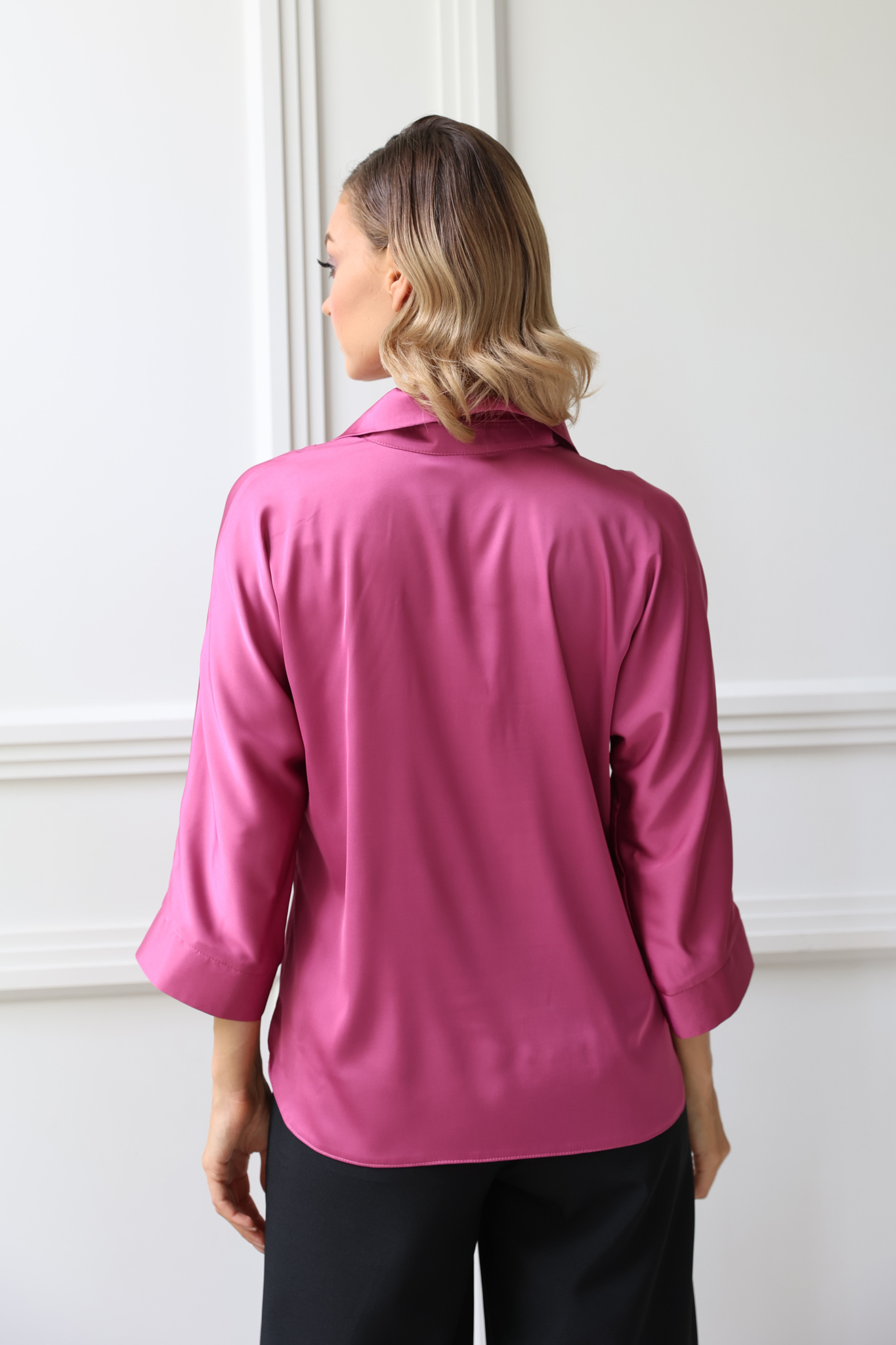 Блузка прямого кроя с полукруглым низом. Ворот с V-вырезом и отложным воротом. Широкий, втачной рукав длиной 7/8 с манжетой.