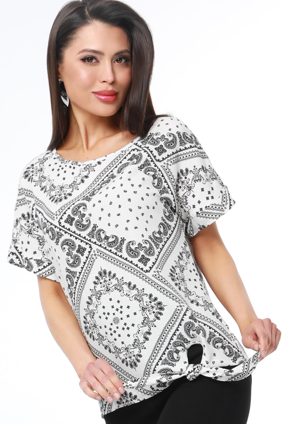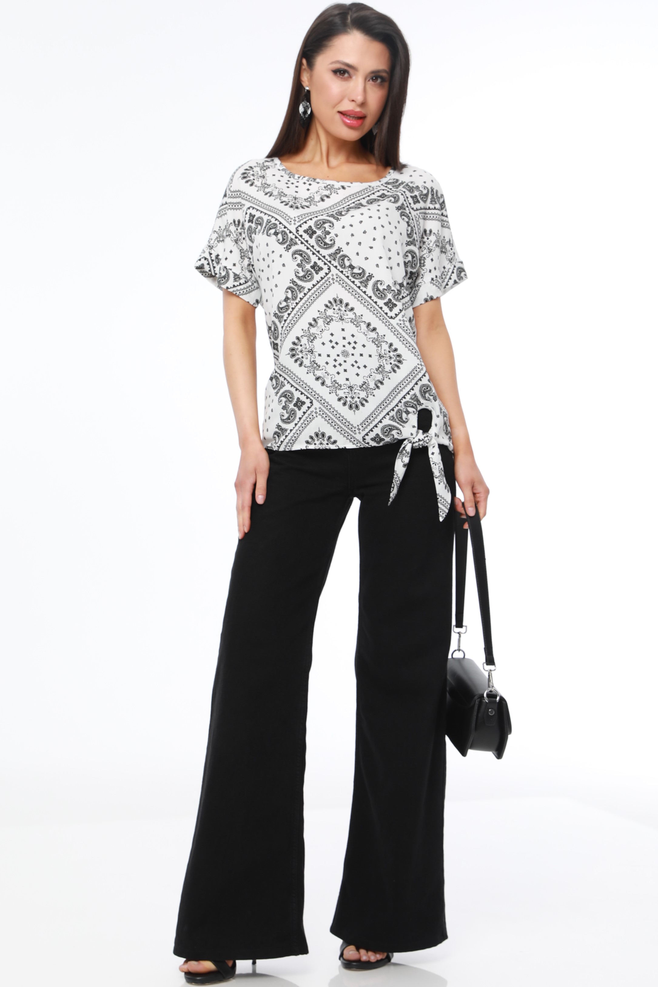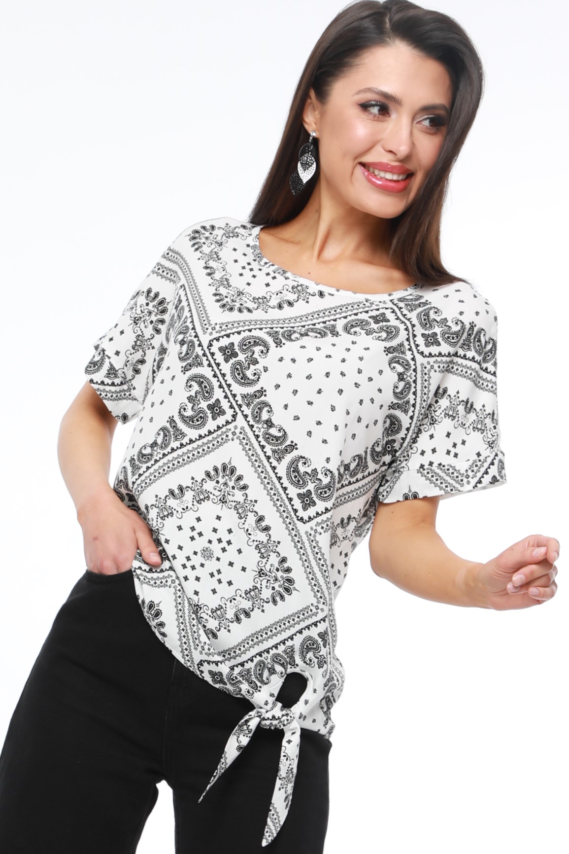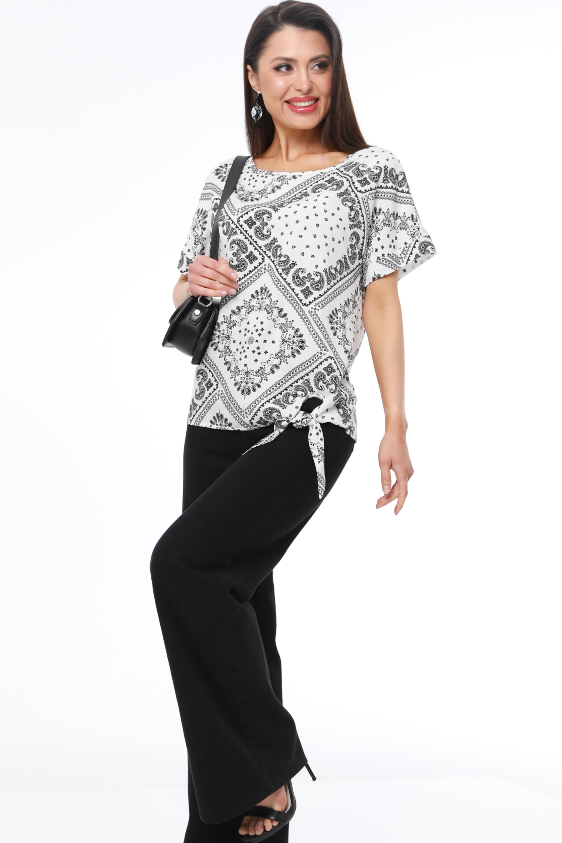 Блузка с коротким рукавом и завязками — нарядная модель, которая добавит разнообразия как в повседневный, так и в офисный гардероб. Свободный фасон с округлым вырезом прекрасно смотрится на любой фигуре, не сковывает движений и дарит чувство легкости. Изюминкой блузки становятся завязки сбоку, которые можно завязать как на узел, так и на модный в этом сезоне бант, чтобы добавить образу женственные нотки. Модель выполнена из качественной, приятной к телу вискозной ткани, которая хорошо пропускает воздух, держит форму и не скатывается. Чтобы блузка долго радовала вас красотой и качеством, рекомендуется стирать ее в бережном режиме без отжима при температуре до 30 градусов и сушить в расправленном виде.