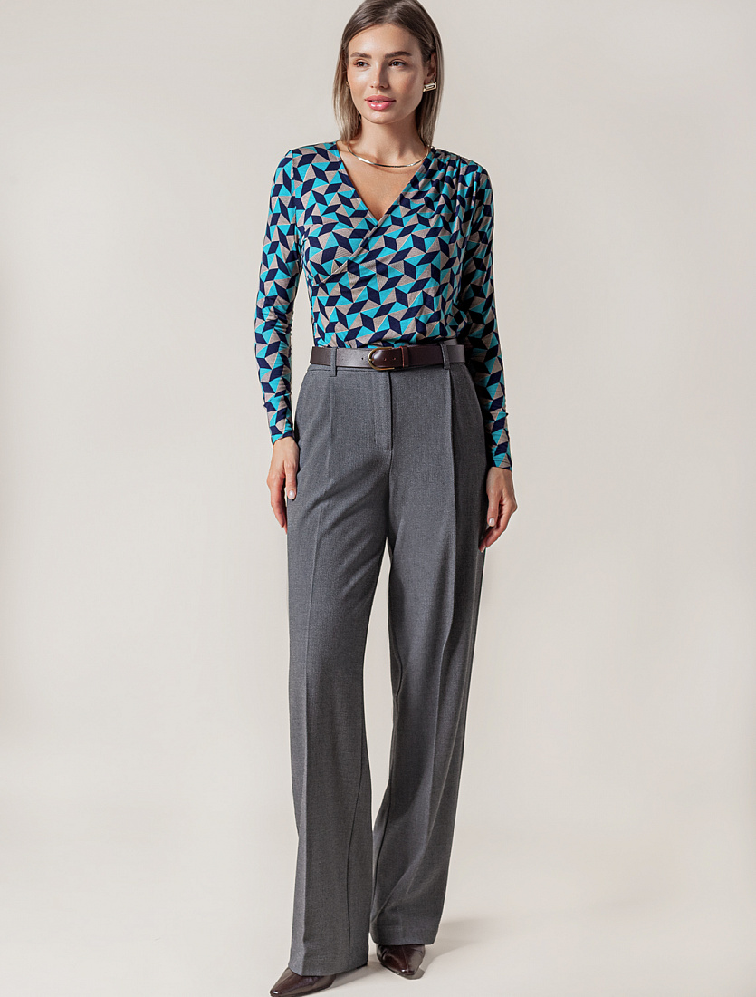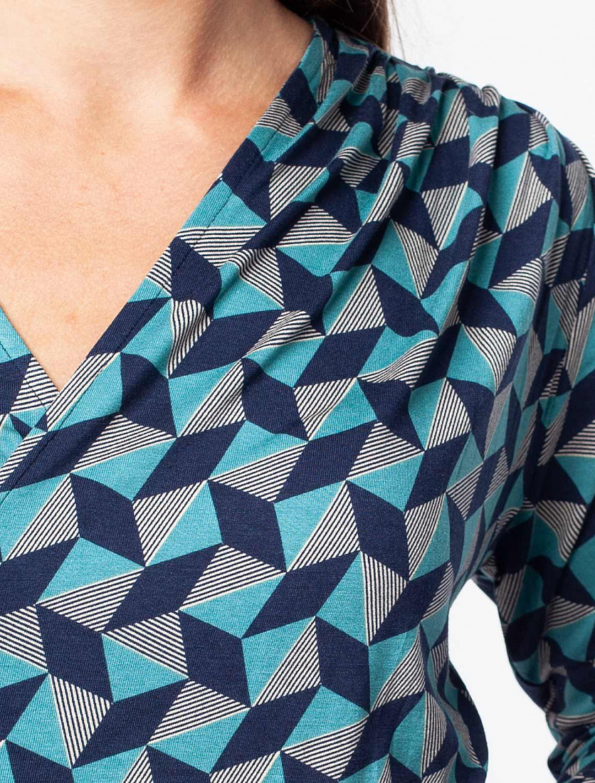 Блузка на запАх сшита из трикотажной вискозы с эластаном. Ассиметричный крой и геометрический принт, подчеркнут сборкой на левом плече. Мягкое полотно как вторая кожа, безупречно ложится по фигуре. Подчеркивает достоинства и скрывает неровности.