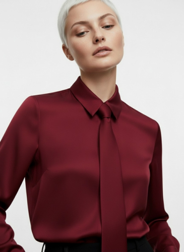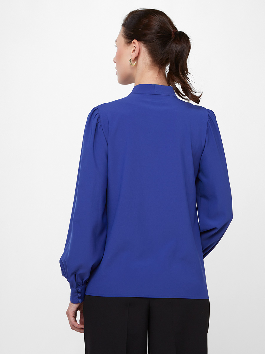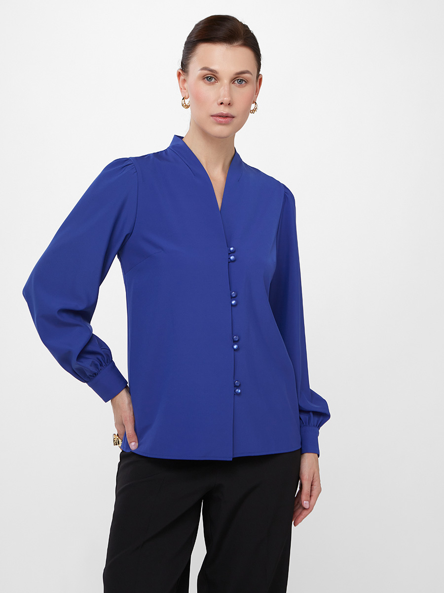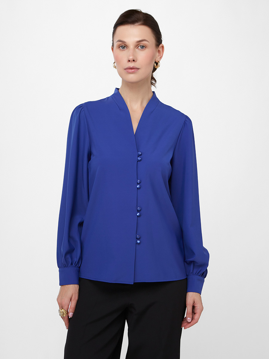 Блузка прямого силуэта. Из однотонной блузочной ткани. Воротник-стойка с V-образным вырезом.Рукав втачной, длинный со сборкой по плечу и по низу, на манжете. Застежка на навесные петли и пуговицы на ножке. Рост модели 170 см. Изделие на модели 42 р-ра. Длина изделия по спинке 63 см.