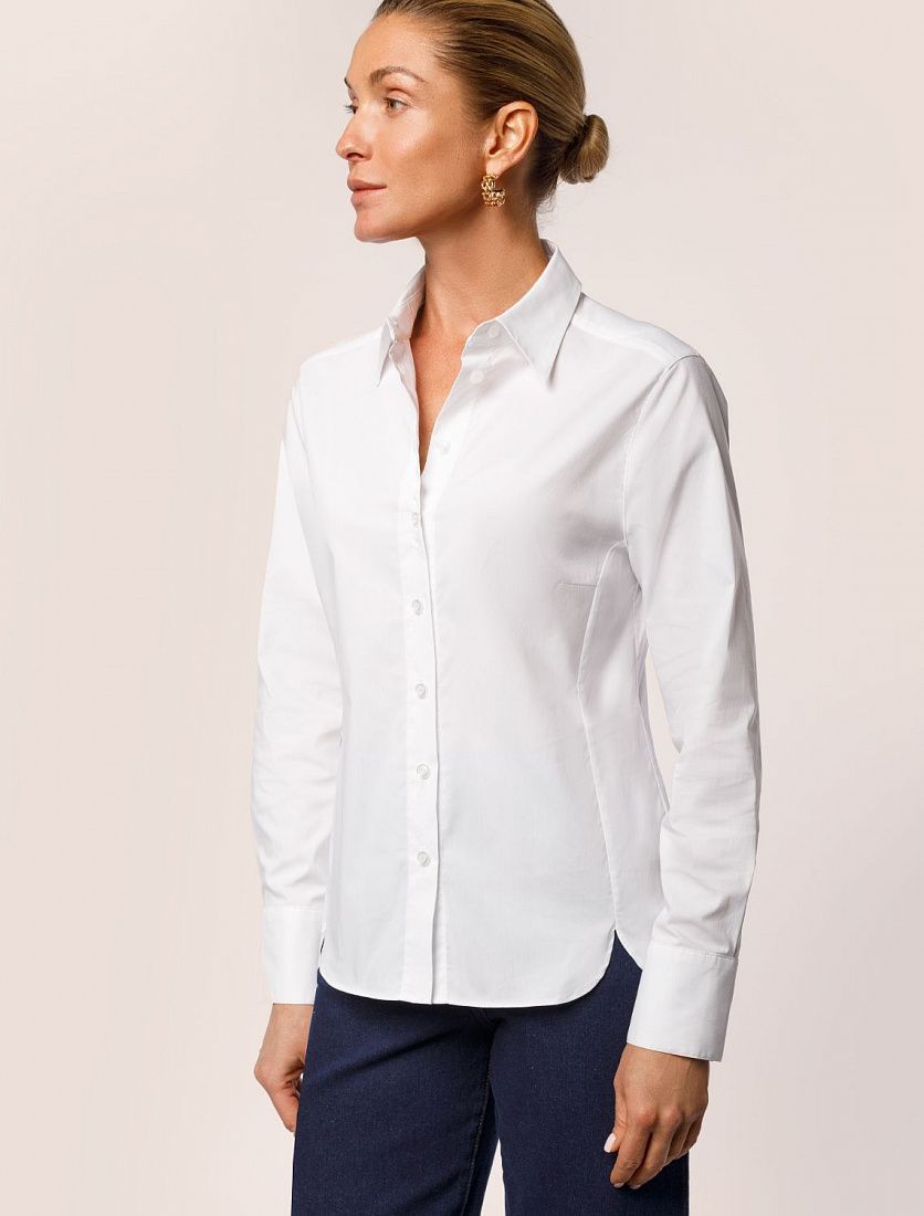 Блузка приталенного силуэта выполнена из эластичного хлопка. Безупречно сидит по фигуре не сковывая движений. Материал обладает высокой формоустойчивостью и воздухопроницаемостью, поддержвая оптимальный микроклимат в течении всего дня. Классический образ можно собрать в паре с черными прямыми брюками или юбкой с разрезами, повседневный расслабленный с джинсами или брюками с пу-покрытием.