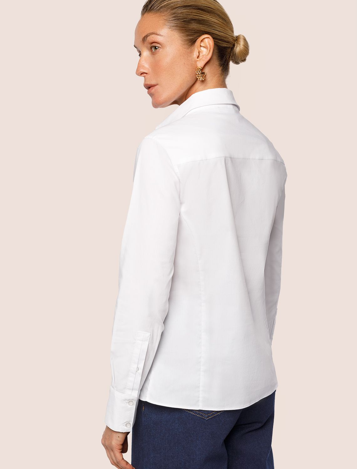 Блузка приталенного силуэта выполнена из эластичного хлопка. Безупречно сидит по фигуре не сковывая движений. Материал обладает высокой формоустойчивостью и воздухопроницаемостью, поддержвая оптимальный микроклимат в течении всего дня. Классический образ можно собрать в паре с черными прямыми брюками или юбкой с разрезами, повседневный расслабленный с джинсами или брюками с пу-покрытием.